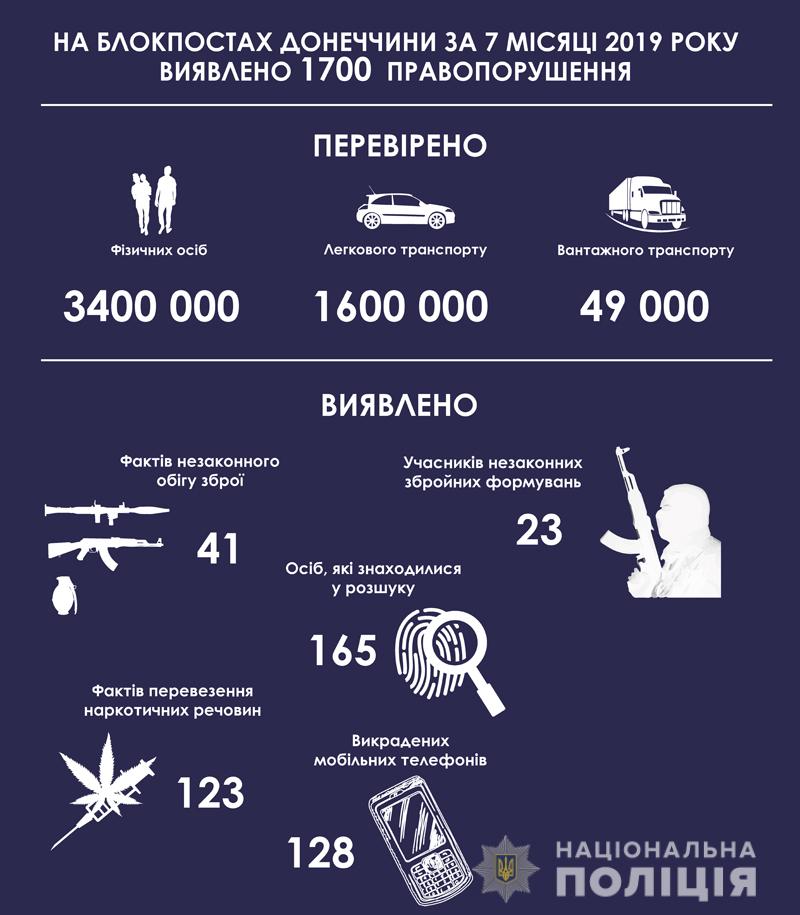 В результаті припинено понад 40 перевезень зброї та боєприпасів. Цього тижня поліцейські запобігли ввезенню у Маріуполь автомату Калашникова та газового пістолету. Збройовий набір був захований у багажнику автомобіля «Lexus», який значився у базах як викрадений в Черкаській області.