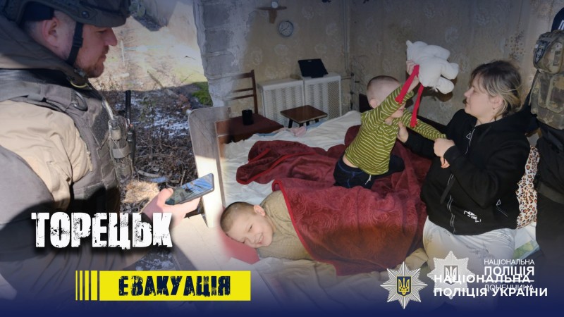 Поліцейські спільно з евакуаційною групою ДСНС «Фенікс» вивезли з-під обстрілів 6 людей: двох хлопчиків, їхніх батьків і маломобільних бабусь. Наразі вся сім'я - разом у безпеці, для них підшукали прихисток у Києві. У Торецьку залишилося 17 дітей.