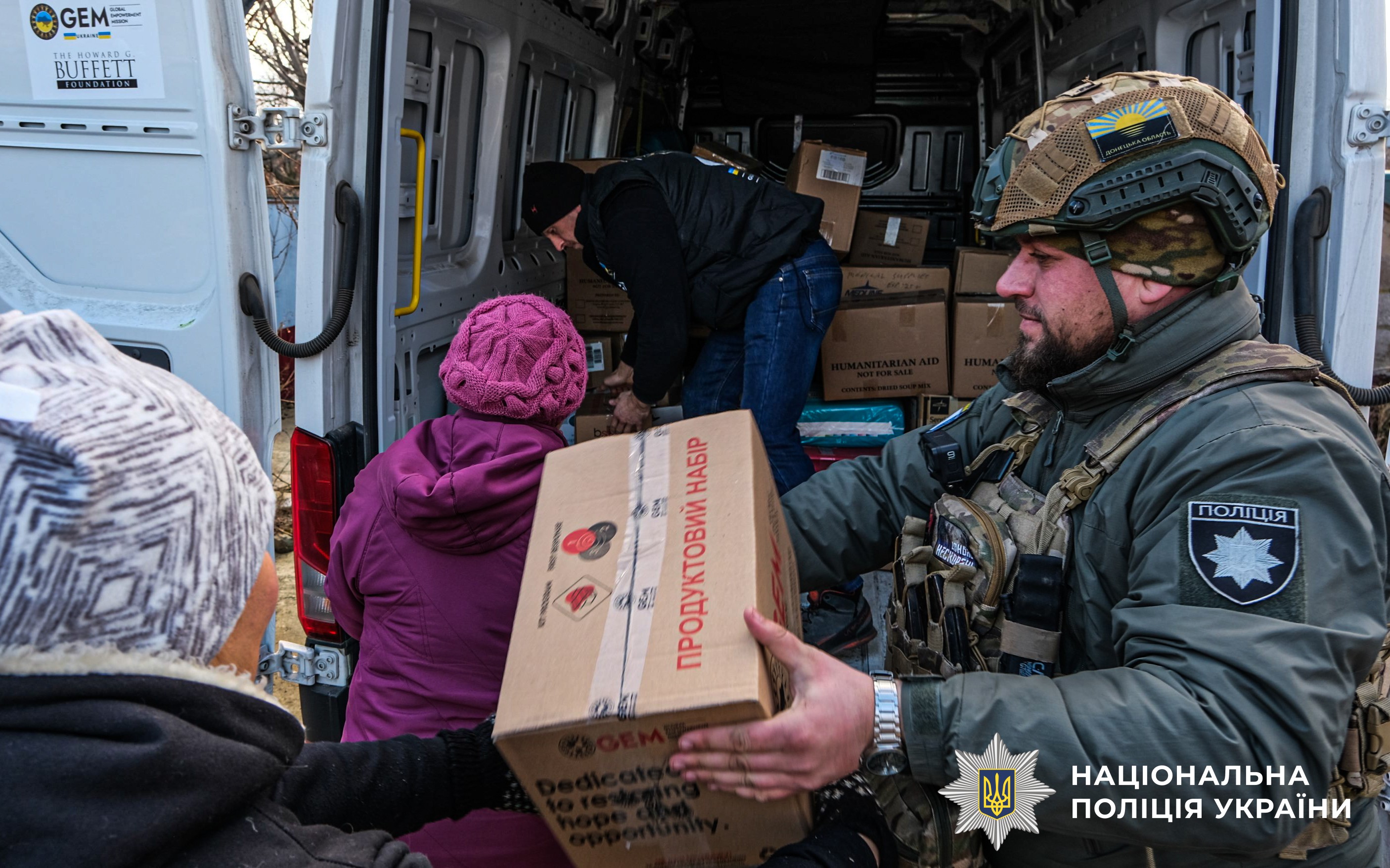 Під час роздачі наборів правоохоронці закликали людей евакуюватись, зауваживши, що в інших громадах їх забезпечать усім необхідним для життя.