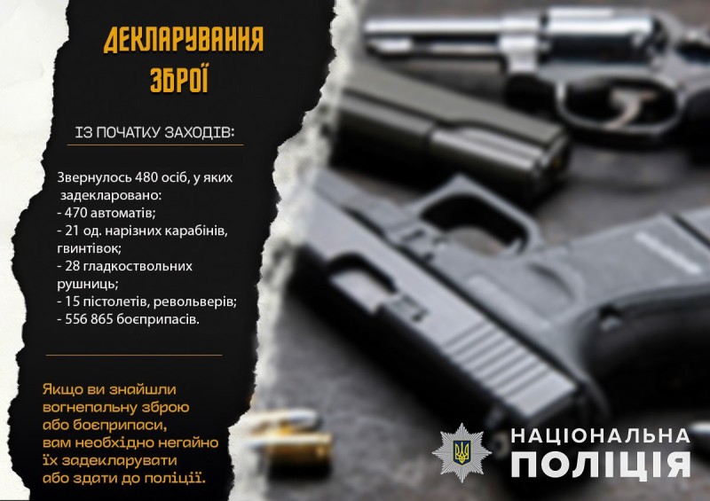 З початку кампанії декларування до підрозділів поліції Донецької області звернулося понад 480 людей. Серед задекларованого – 470 одиниць автоматичної зброї, 28 гладкоствольних рушниць, 21 одиниця карабінів та гвинтівок, 15 пістолетів, а також понад 556 тисяч боєприпасів.