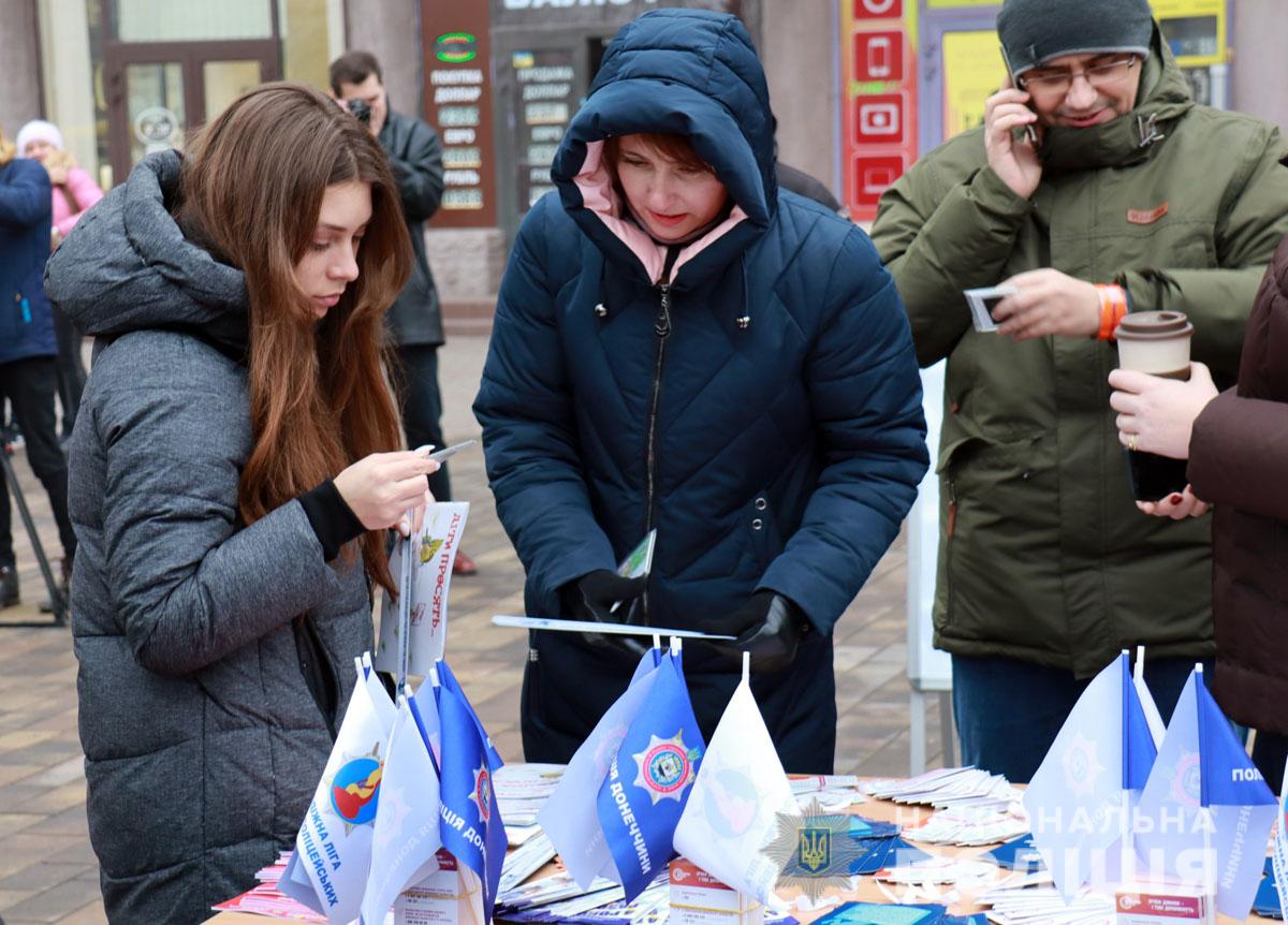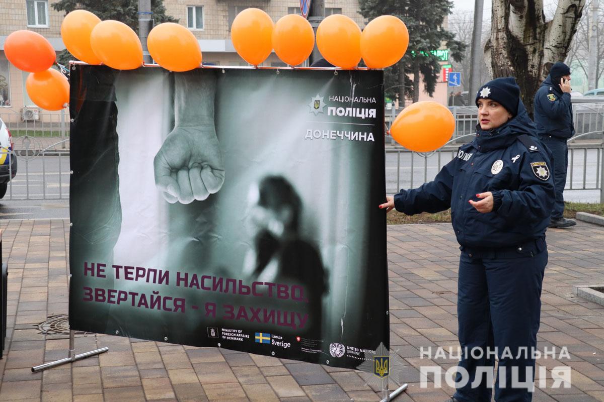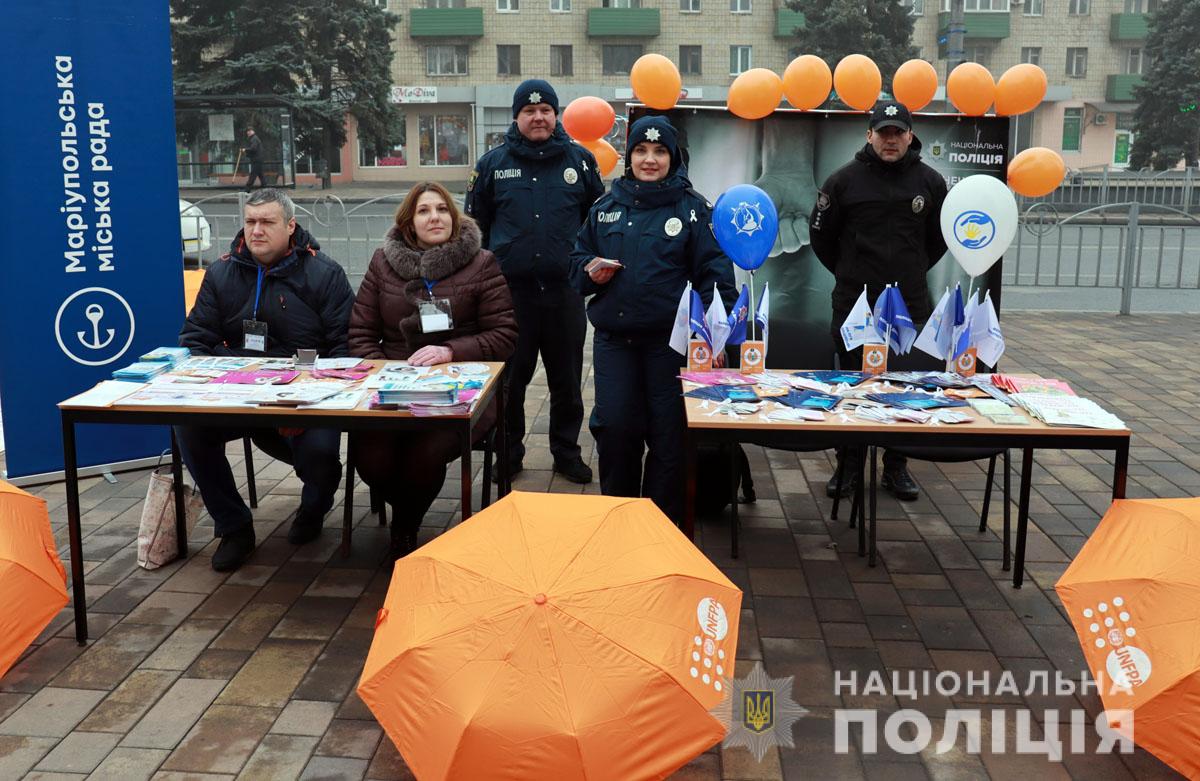 Сьогодні у Маріуполі в рамках щорічної Всеукраїнської акції «16 днів проти насильства» відбувся тематичний захід під гаслом «Дій проти насильства!». Його ініційовано Головним управлінням Національної поліції в Донецькій області та проведено спільно з поліцією Маріуполя, патрульною поліцією, курсантами Донецького юридичного інституту, представниками міської ради та Маріупольського місцевого центру з надання безоплатної правової вторинної допомоги.