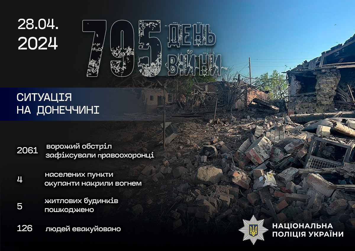 За добу поліція зафіксувала 2 061 обстріл по території Донецької області. Ворог бив авіабомбами, реактивними системами залпового вогню, артилерією.
