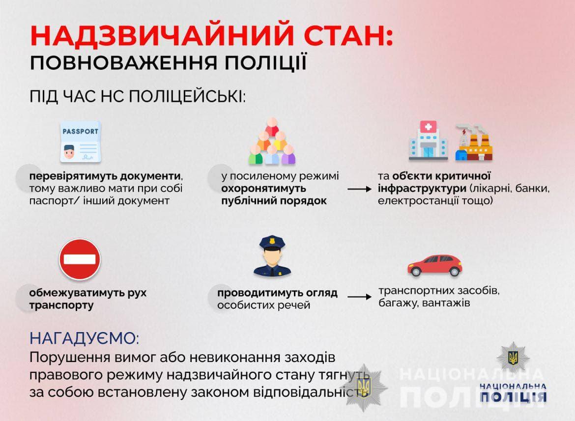 - Запроваджується особливий режим в’їзду і виїзду на окремих територіях держави та в населених пунктах. Будуть виставлені відповідні пости поліцейських та нацгвардійців