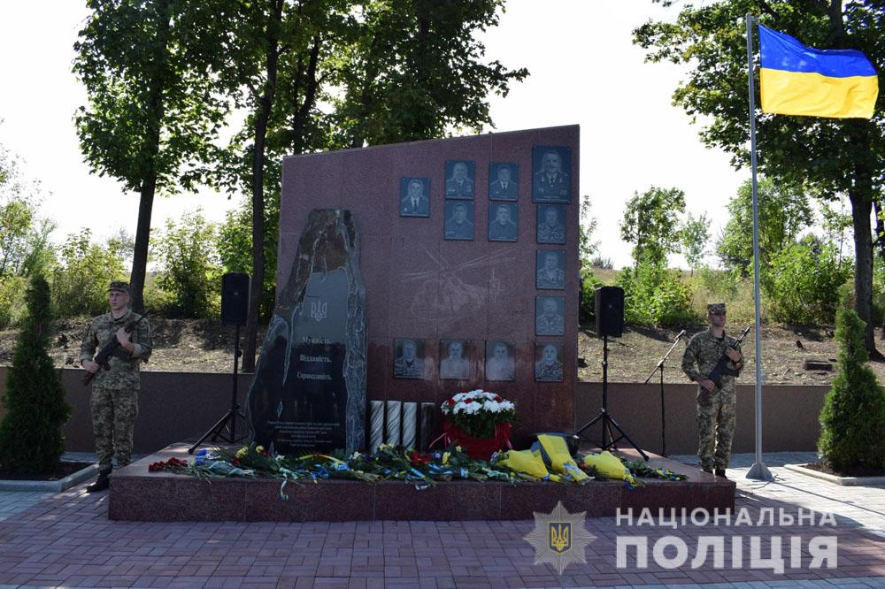 Присутні поклали квіти до меморіалу військовослужбовцям Національної гвардії та правоохоронцям, які загинули у збитому бойовиками гелікоптері під Слов’янськом 29 травня 2014 року.