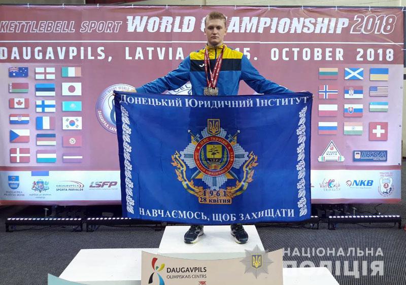 З 10 по 15 жовтня 2018 року у латвійському Даугавпілсі відбувся чемпіонат світу серед дорослих, юніорів та ветеранів . Серед 526 спортсменів з 32 країн світу участь у форумі у складі юніорської збірної команди України взяв провідний спортсмен Донецького юридичного інституту МВС України майстер спорту України з гирьового спорту курсант 203/17-го навчального взводу рядовий поліції Владислав Хоменко, який виступав аж у трьох змагальних дисциплінах.