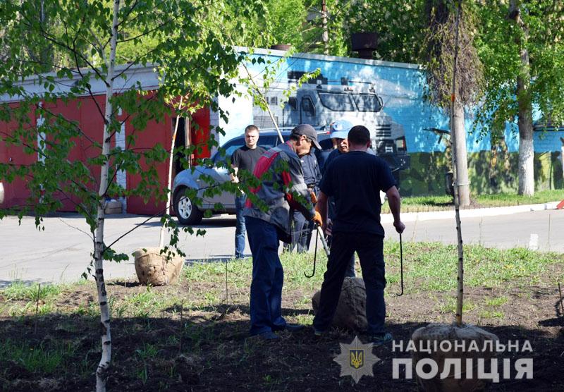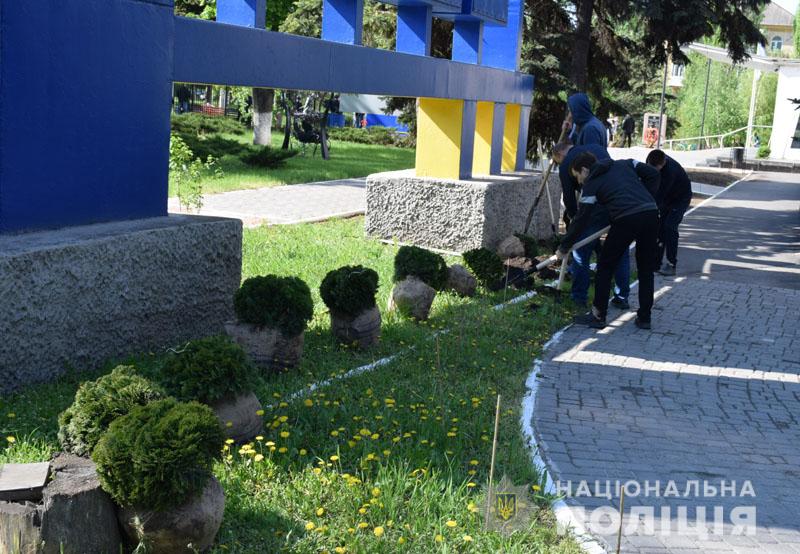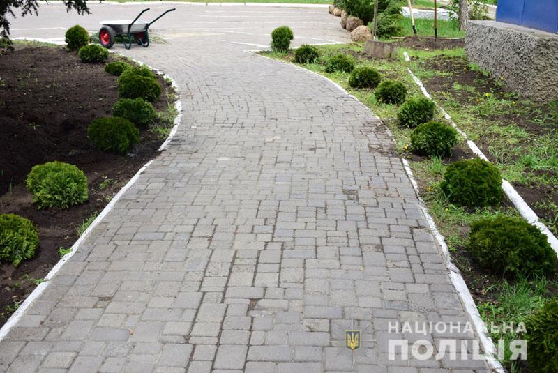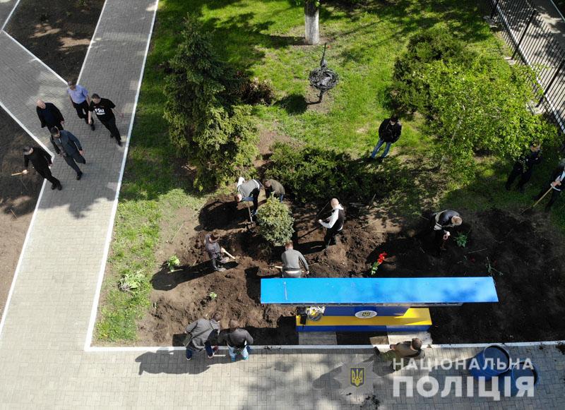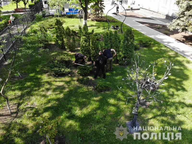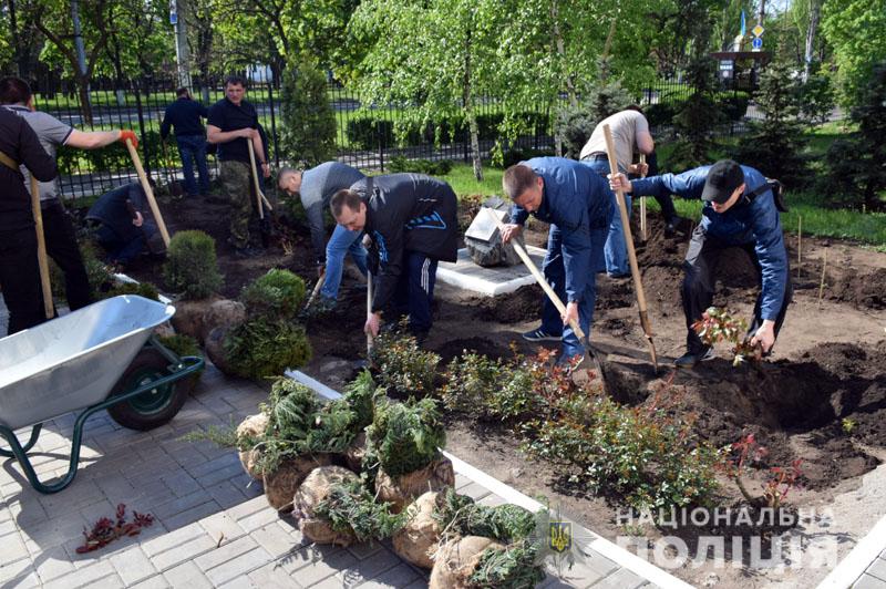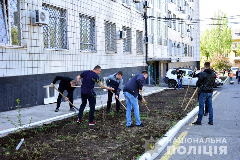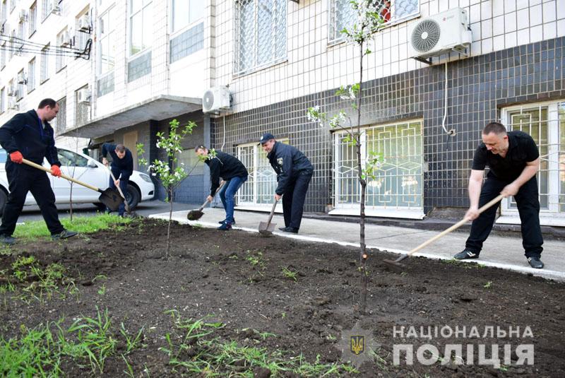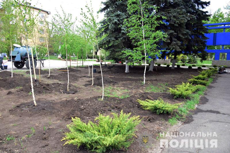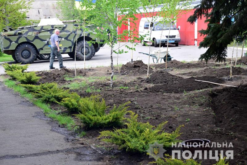 Ялинки, берези, акація, карагана, туї двох видів, ялівець чотирьох видів – правоохоронці прикрасили двір адміністративної будівлі молодими деревами та кущами на зміну старому саду. Всього висадили 170 кущів і дерев та 100 троянд.