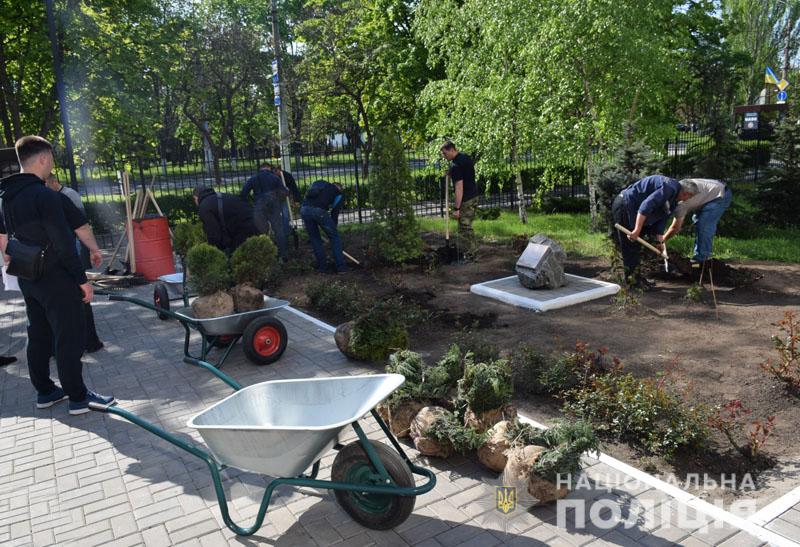 В обласному управлінні поліції проведені масштабні ландшафтні роботи, до яких долучилися самі співробітники главку. За підтримки спеціалістів ландшафтного дизайну поліцейські кожного підрозділу власноруч озеленили територію біля свого головного офісу в Маріуполі.
