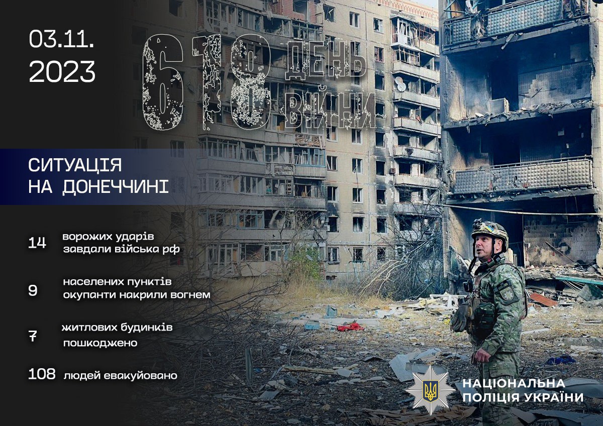 Поліція задокументувала 14 ударів по цивільному населенню. Росія атакувала міста Авдіївка,Торецьк, селища Неліпівка, Курдюмівка, села Бердичі, Ласточкине, Нетайлове, Новоукраїнка, Урожайне.