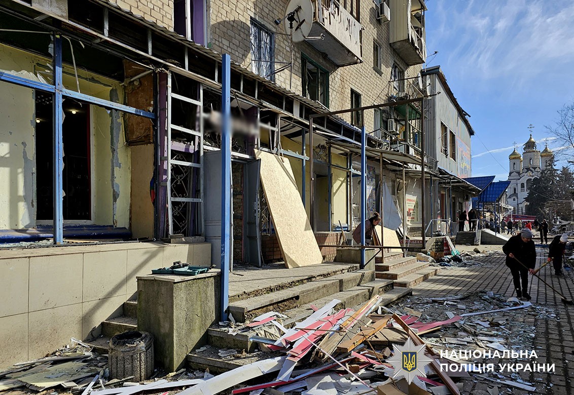 За ніч пошкоджено 15 багатоквартирних і три приватних будинки, 23 магазини, 19 торговельних павільйонів, будівлю вокзалу, храм, пункт техобслуговування, три заклади освіти, пошта, дві адмінбудівлі, дві аптеки, кіоск.