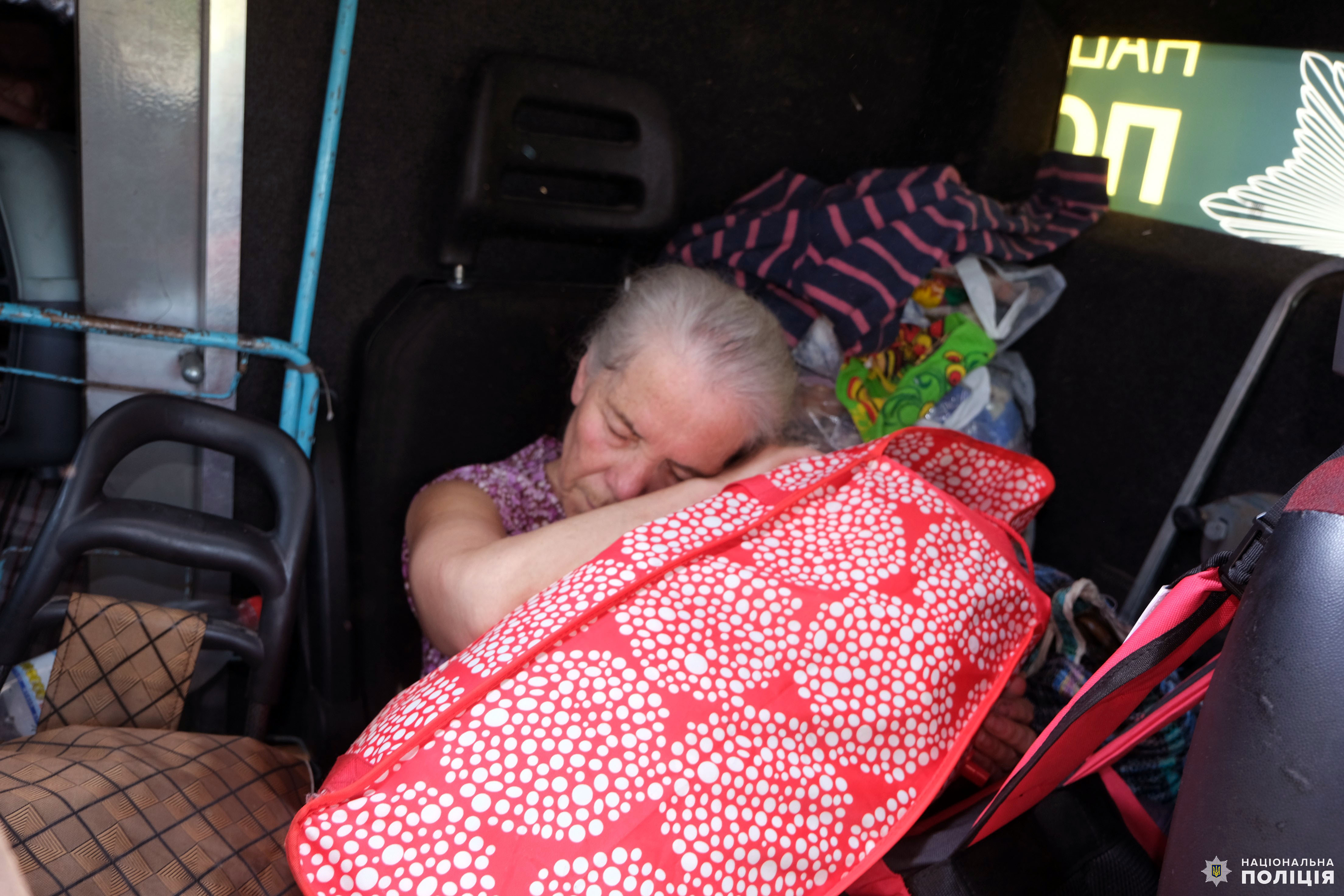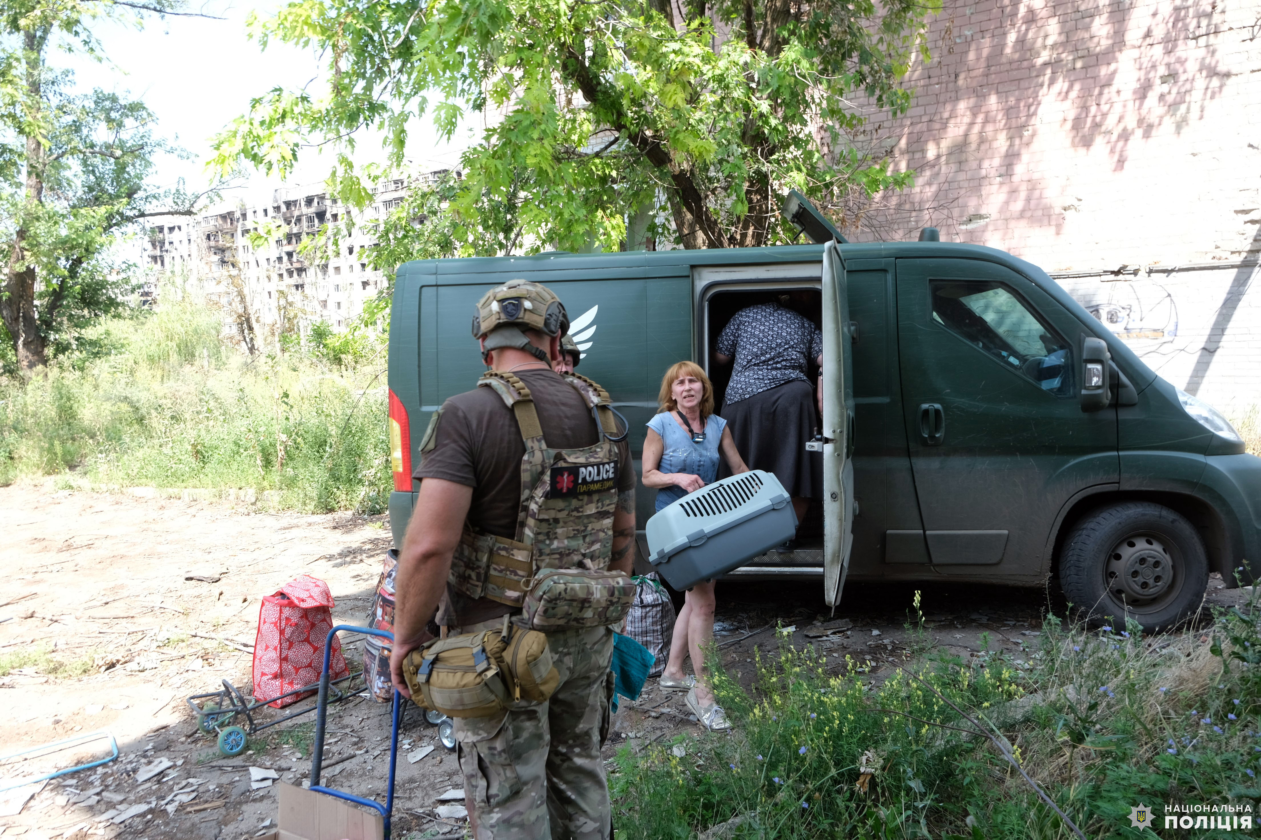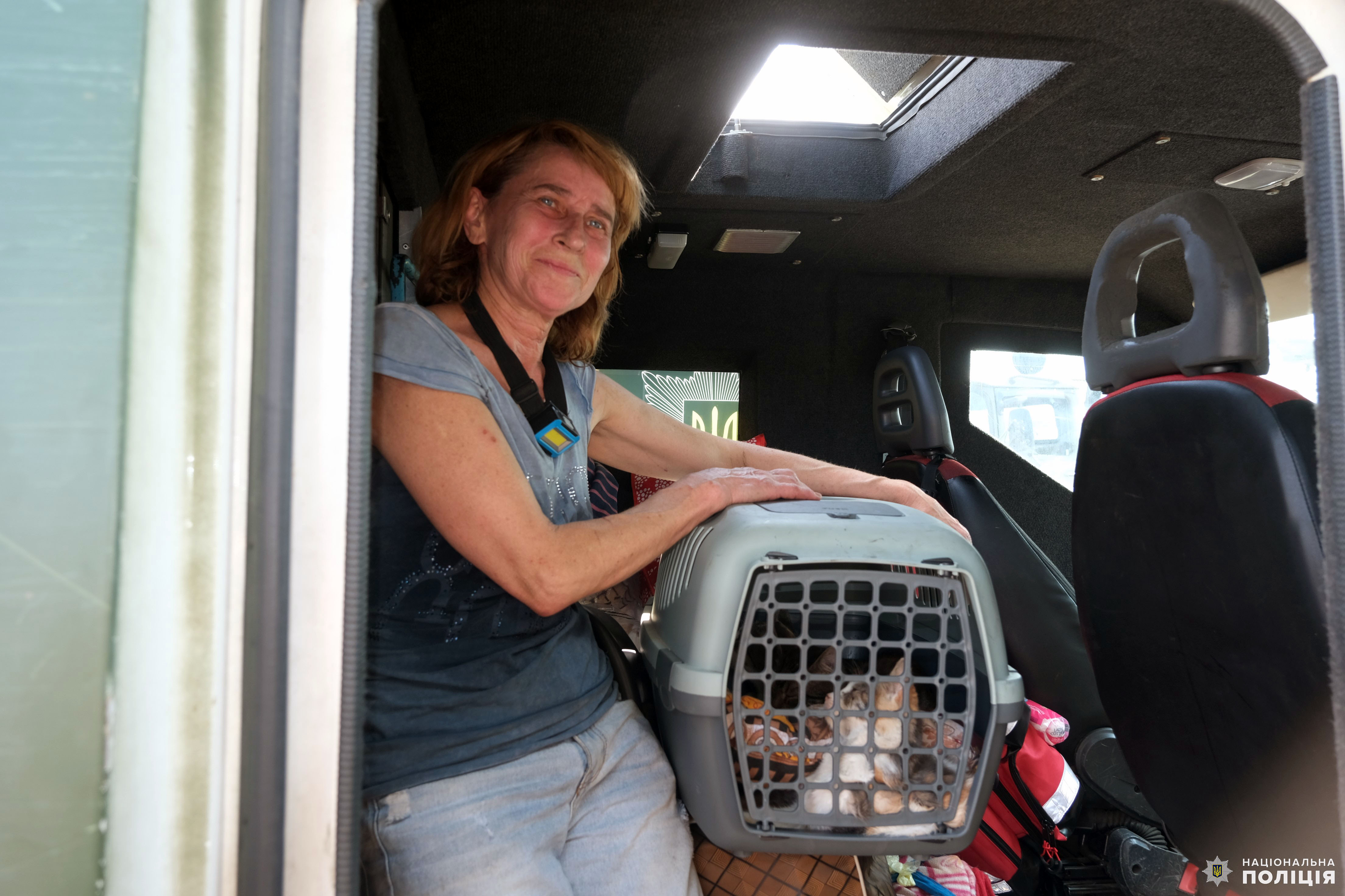 При в’їзді в місто ворожий дрон помітив машину правоохоронців. Окупанти відкрили вогонь по локації, де «білі янголи» забирали людей. Між прильотами правоохоронці разом з пасажирами та їхніми пухнастими вихованцями швидко залишають місто, адже знають, що війська рф прицільно б’ють по них.