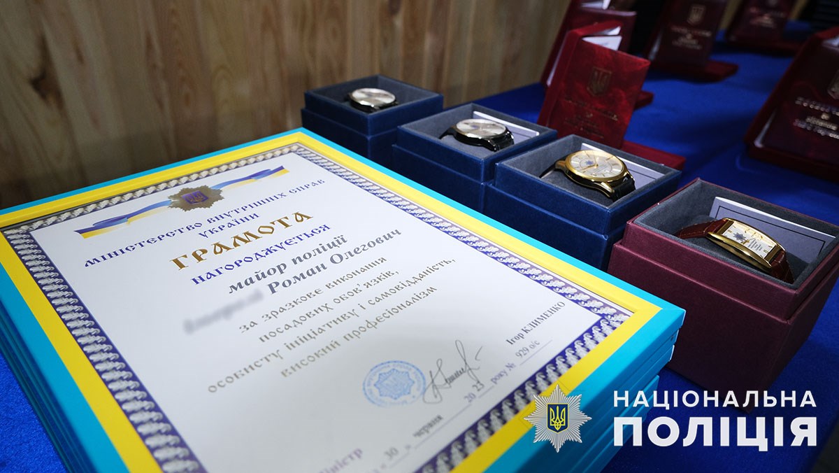Кращі поліцейські отримали відзнаки МВС, Нацполіції та оперативно-стратегічного угрупування військ «Таврія», подяки від військової адміністрації та цінні подарунки - годинники.