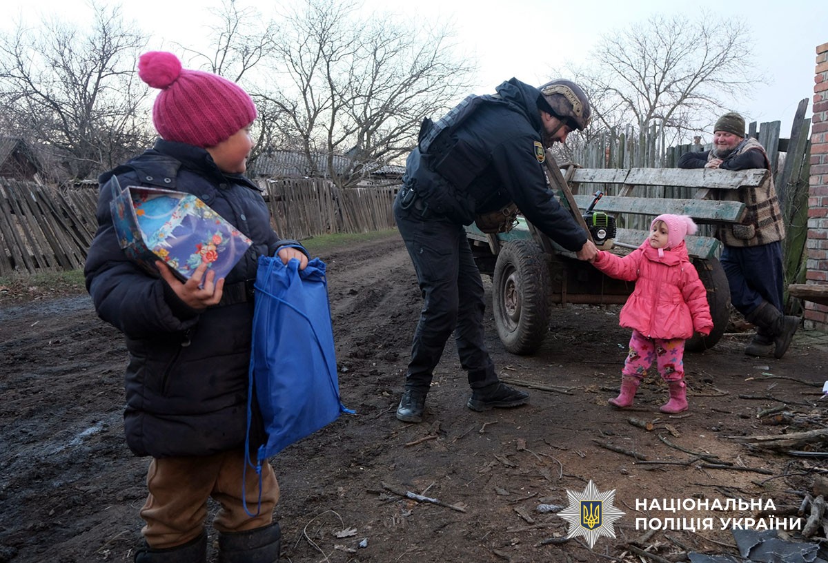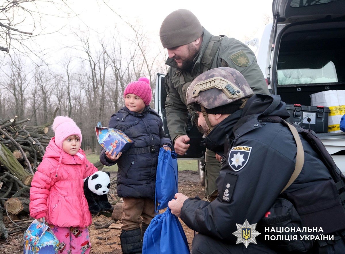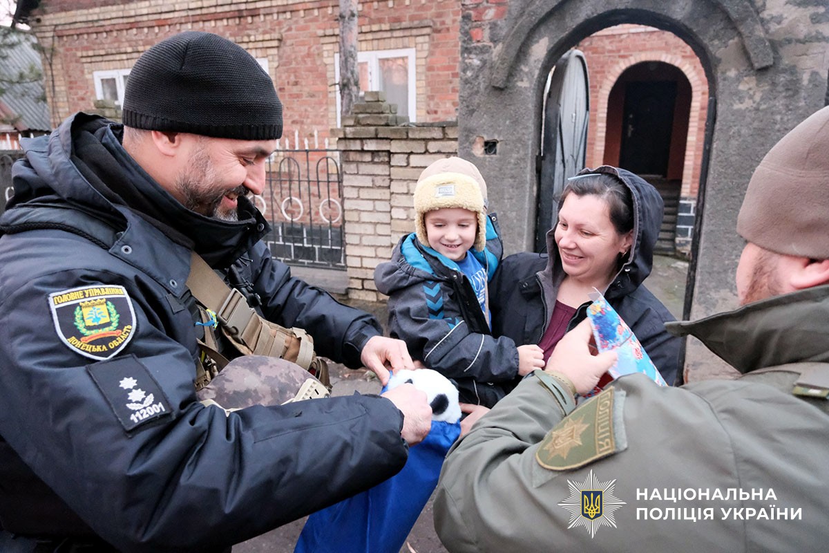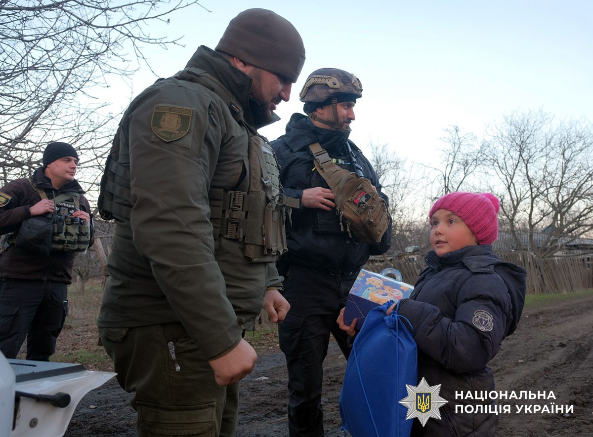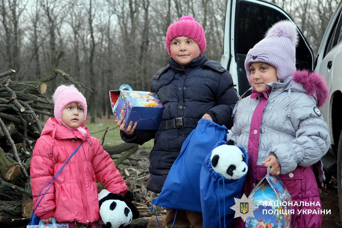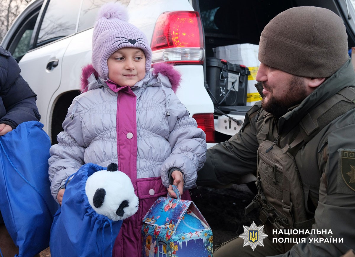 Правоохоронці вирушили у прифронтові населені пункти: дітлахам дарували смаколики, а батьків закликали вберегти життя маленьких та евакуюватись. З найомріянішими подарунками поліцейські завітали й до дітей своїх колег, які віддали життя заради незалежності України.