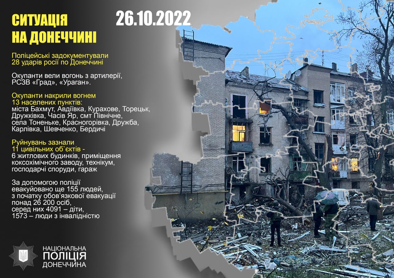 За допомогою поліції евакуйовано ще 155 людей, з початку обов’язкової евакуації понад 26 200 осіб, серед них 4091 – діти, 1573 – люди з інвалідністю.