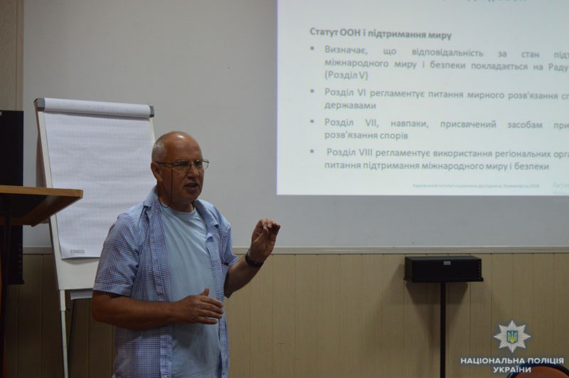 Правоохоронці, за якими безпосередньо закріплена робота з громадянами, дізналися про особливості роботи поліції після закінчення збройних конфліктів та про діяльність міжнародних організацій (ООН, ОБСЄ, Євросоюзу, Африканського союзу) щодо забезпечення міжнародного миру та безпеки. З такою доповіддю виступив перед учасниками тренінгу Олексій Телічкін, який неодноразово брав участь в операціях Організації Об’єднаних Націй в гарячих точках планети, таких як Боснія, Косово, Грузія, Ліберія.