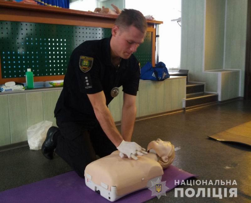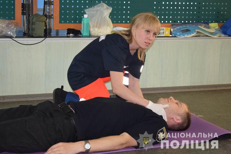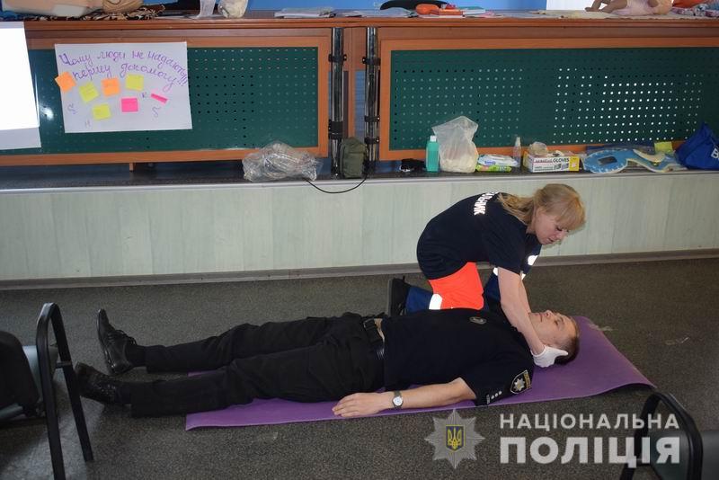 Правоохоронці вчились правильно оцінювати місце події та стан постраждалих, проводити серцево-легеневу реанімацію дорослих та дітей, надавати допомогу при інсульті та інфаркті, кровотечі, пораненнях, пошкодженнях голови та хребта.