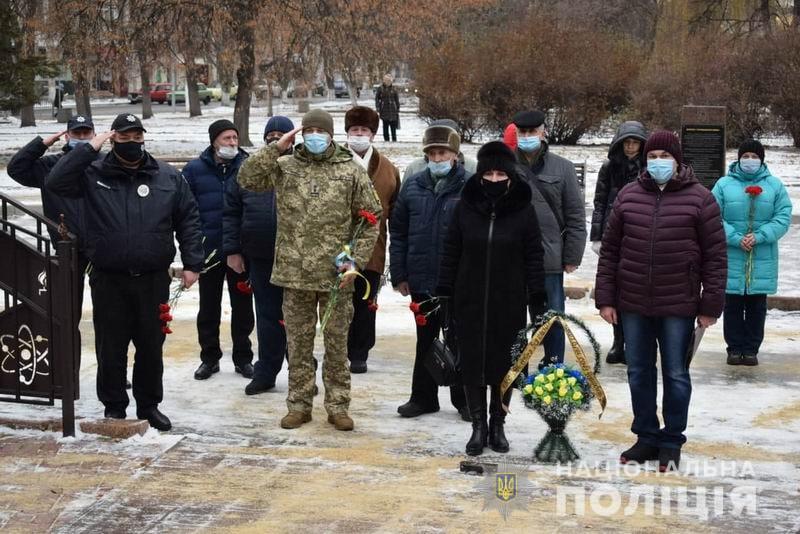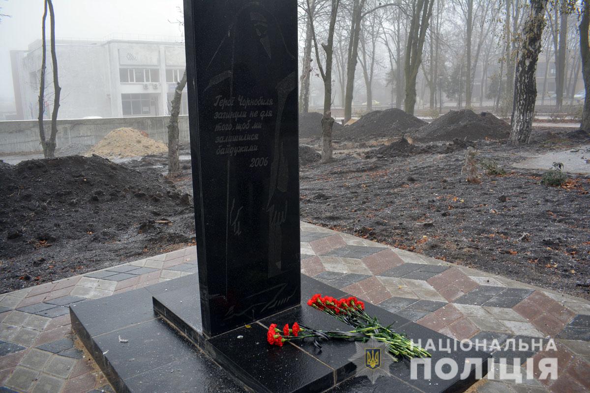Також поліцейські схилили голови у хвилині мовчання, згадуючи тих, хто віддав життя у «битві» з радіацією, та поклали квіти до меморіалів жертвам чорнобильської трагедії.