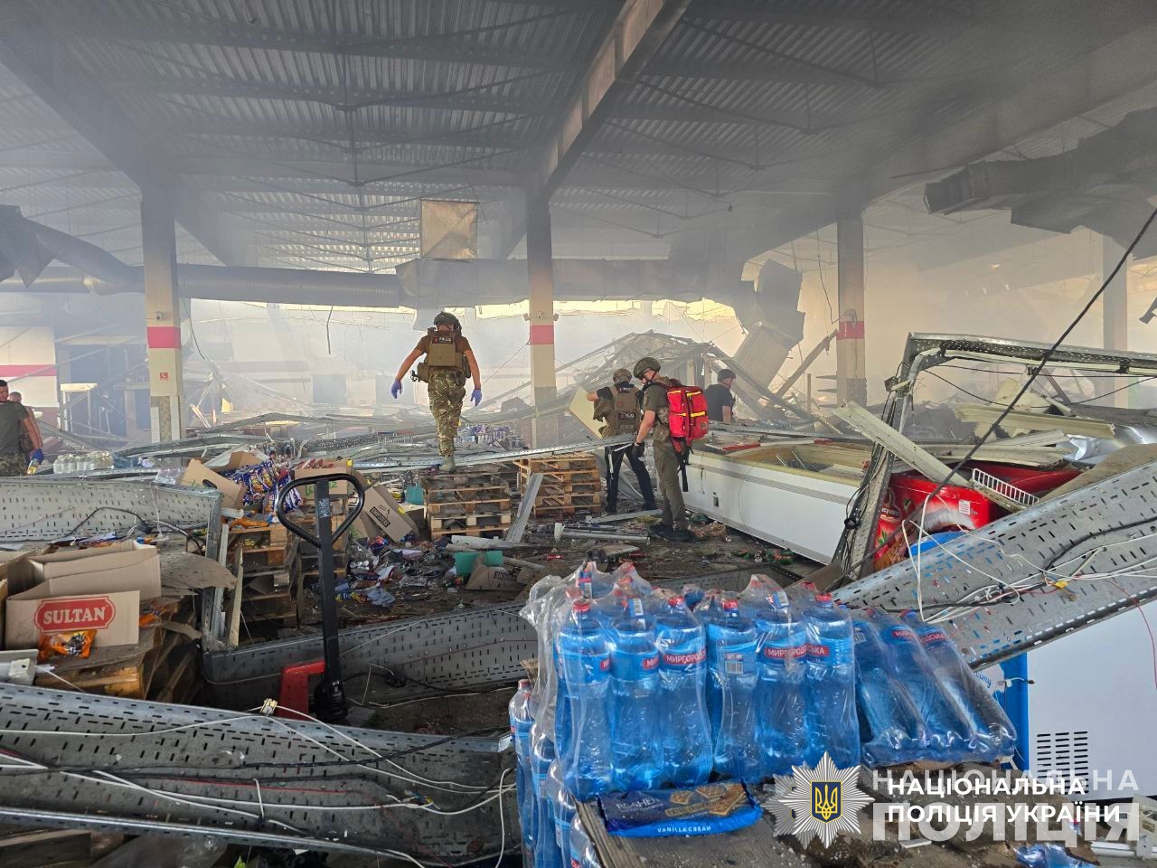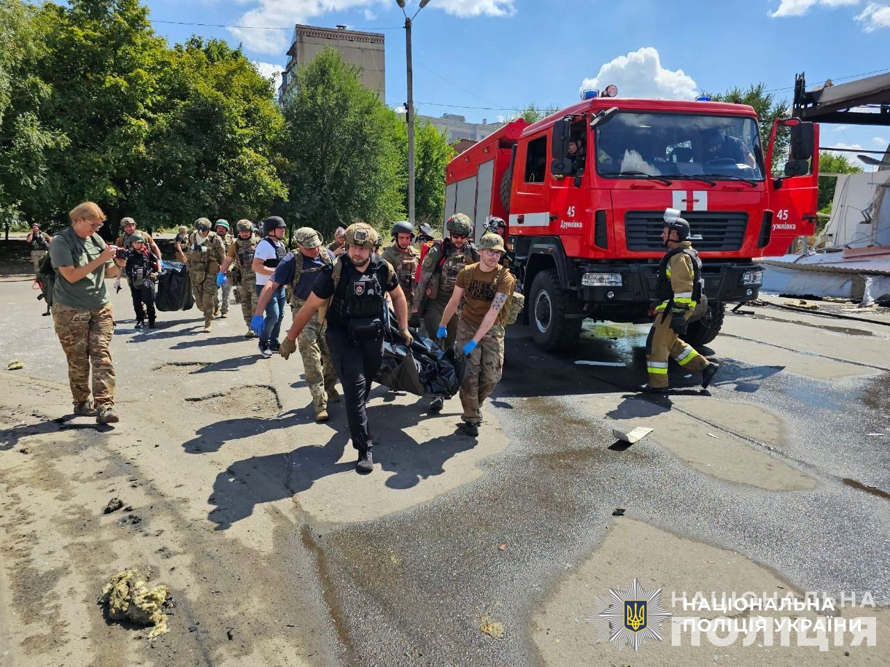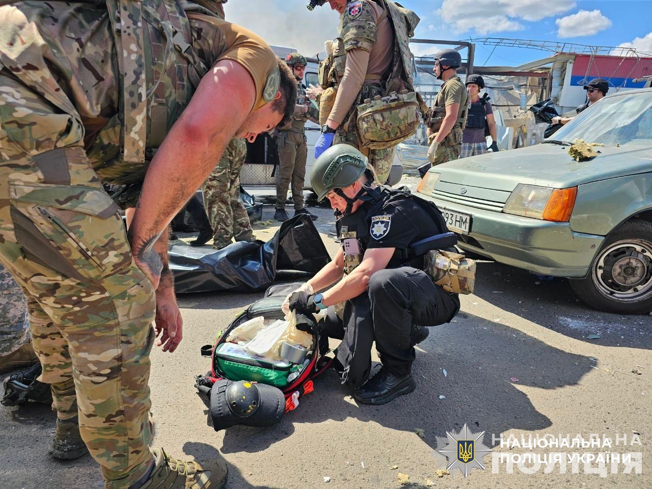 На місці удару працюють поліцейські – слідчо-оперативні групи, парамедики, криміналісти та вибухотехніки. Правоохоронці збирають докази воєнного злочину. Парамедики надають постраждалим першу медичну допомогу та евакуюють до лікарень.