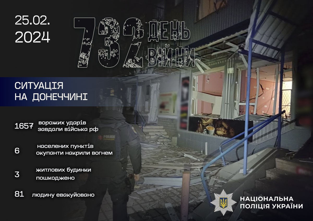 Протягом 24 лютого армія рф обстріляла 6 населених пунктів: місто Костянтинівка, села Кліщіївка, Нетайлове, Новоселівка Перша, Свято-Покровське, Уманське.