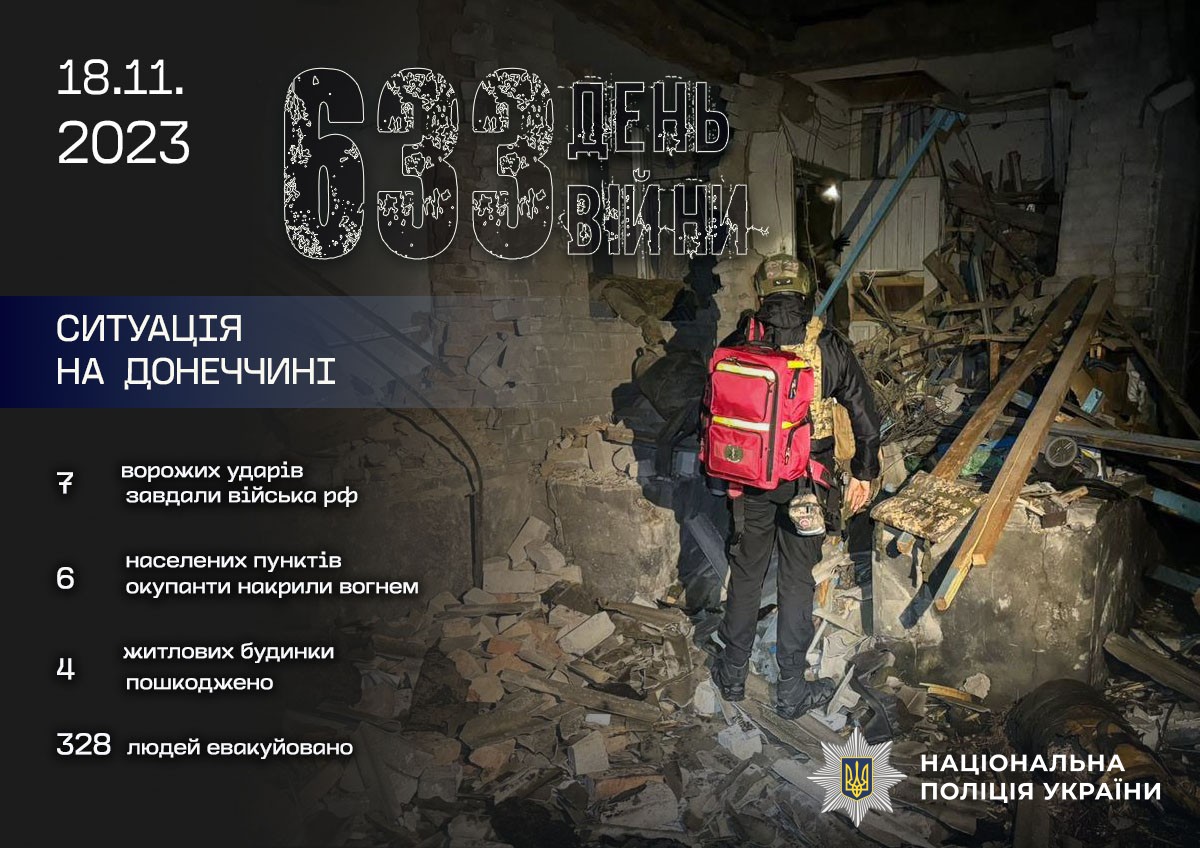 Поліція задокументувала 7 ударів по цивільному населенню. Росія атакувала міста Авдіївка, Торецьк, Курахове, смт Щербинівка, села Нетайлове, Ясна Поляна.
