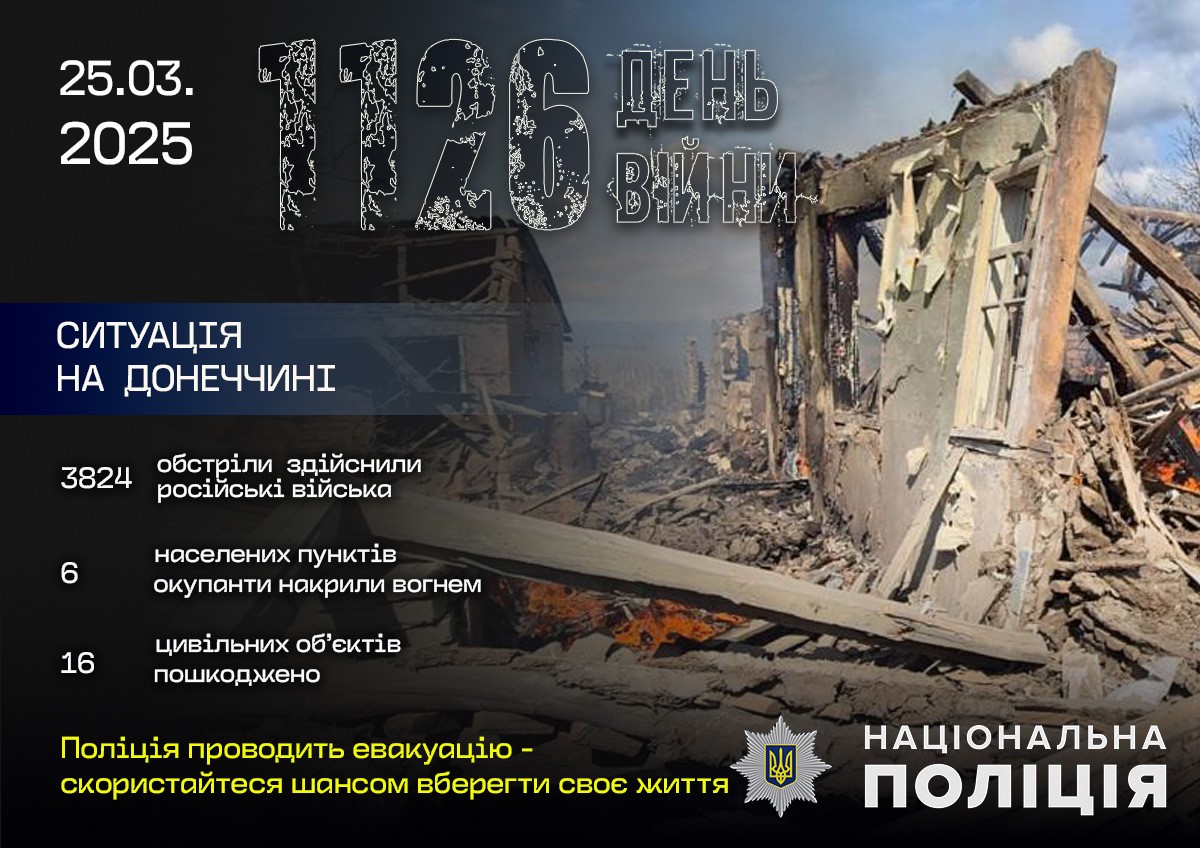 За минулу добу поліція зафіксувала 3 824 ворожих обстріли по лінії фронту та житловому сектору.