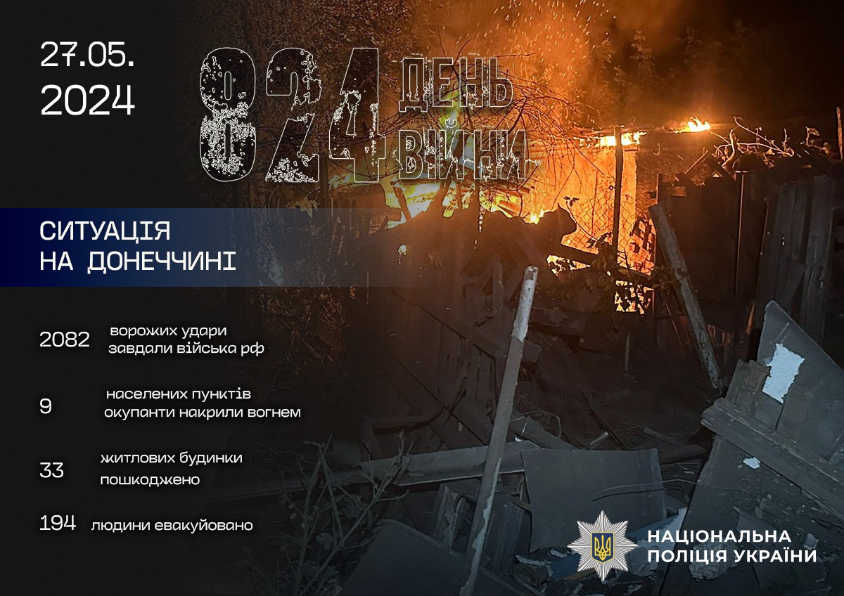 Протягом доби поліція зафіксувала 2082 ворожих обстріли. Армія рф застосувала авіабомби, реактивні системи залпового вогню, артилерію, дрони.