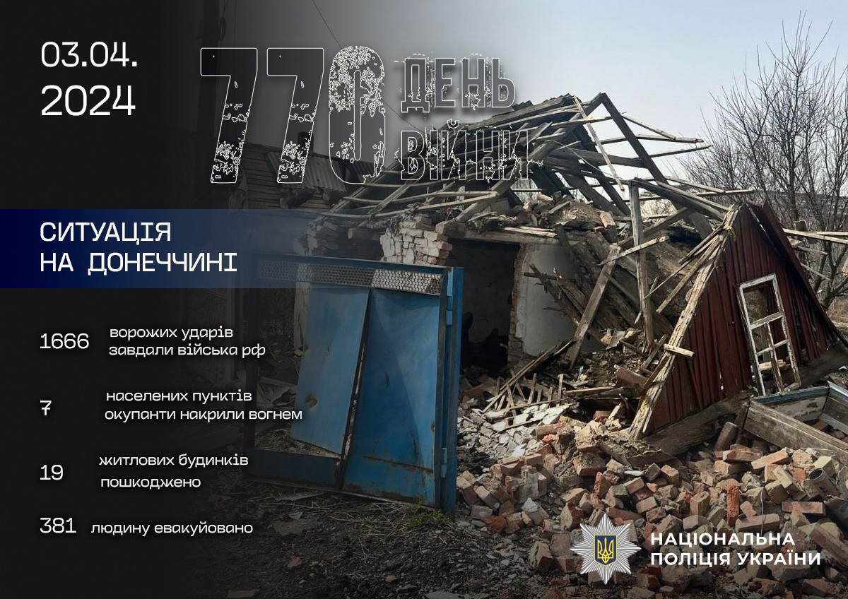 Крім того, у ніч на сьогодні, 3 квітня, російські війська поцілили по Селидовому 5-ма ракетами – попередньо, «С-300». Пошкоджено щонайменше 12 багатоквартирних і 8 приватних будинків, 6 адмінбудівель, підприємство, 5 приватних гаражів. Інформації про постраждалих наразі не надходило.