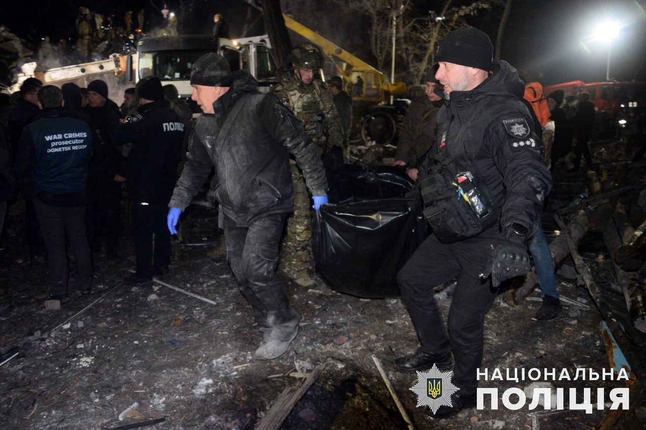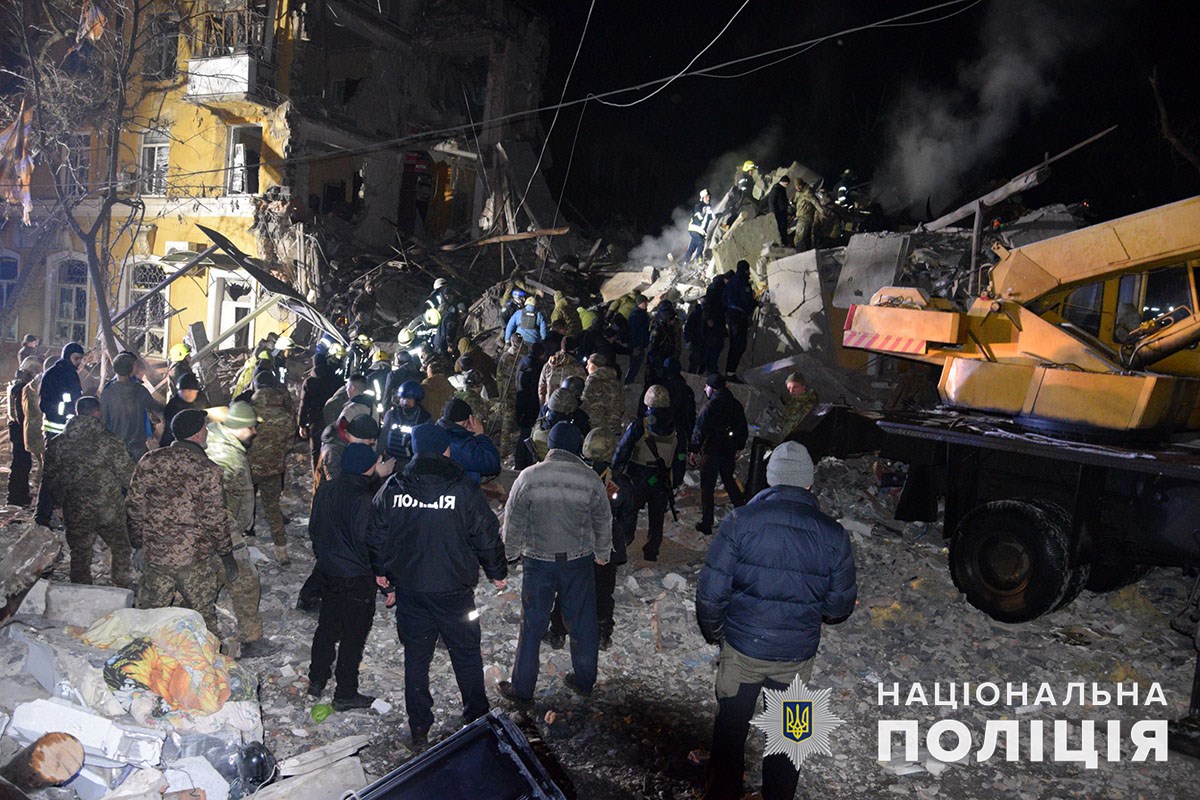 З-під завалів зруйнованого чотириповерхового будинку дістали тіла трьох загиблих: директорку школи та її чоловіка, 47 і 50 років, а також 61-річну жінку. Під руїнами, ймовірно, перебуває ще одна людина, донька загиблої пенсіонерки.