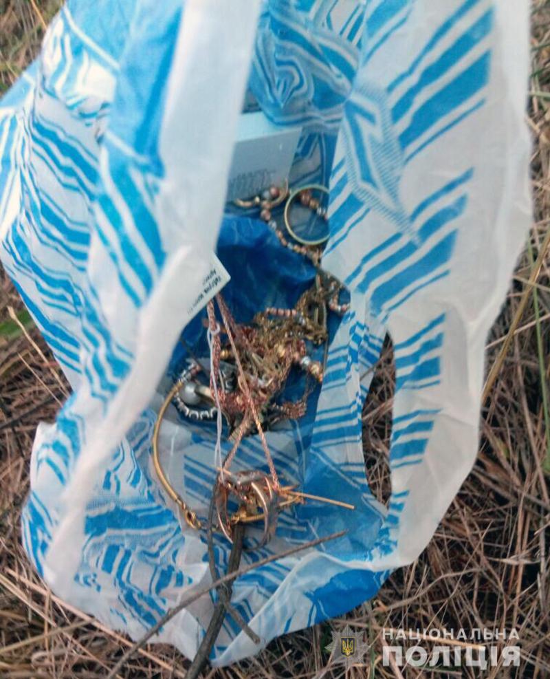 Поліцейські обстежили прилеглу до будинку територію та виявили пакунок з викраденими коштовностями та предмети, які використовували «домушники» під час крадіжки.