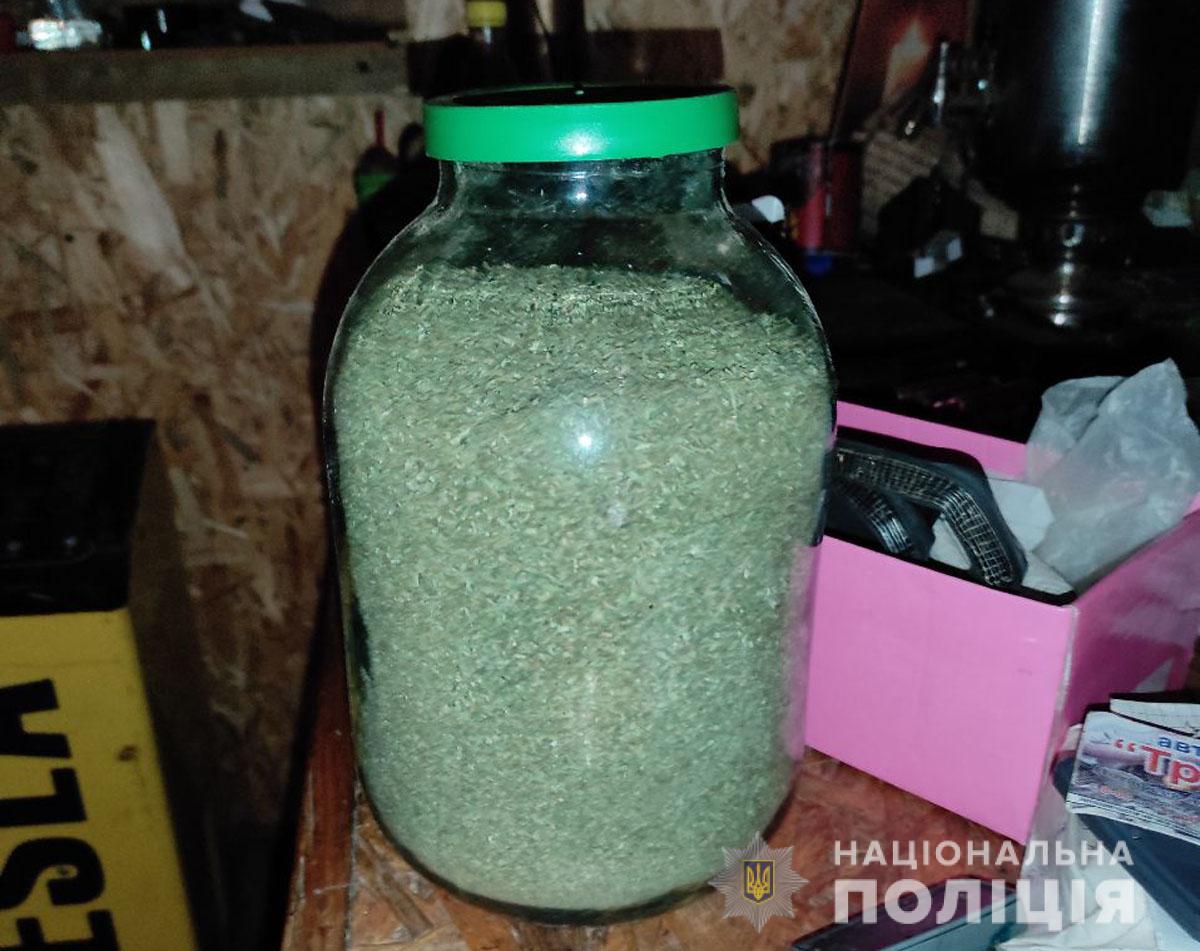 Так, на території приватного будинку фігуранта виявлено трилітрову банку з канабісом та предмет, схожий на пістолет і холодну зброю часів Другої світової війни.