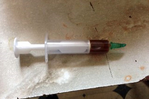 Під час обшуку в квартирі підозрюваного поліцейські вилучили пляшки та шприц з рідиною коричневого кольору. Зі слів господаря, вилучена рідина дійсно є ацетильованим опієм, яку він виготовив самостійно із насіння маку.
