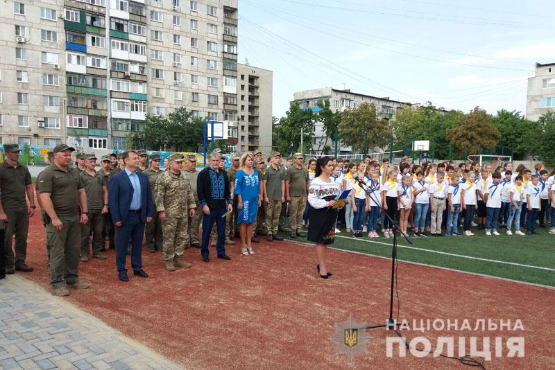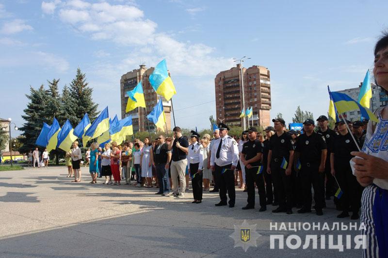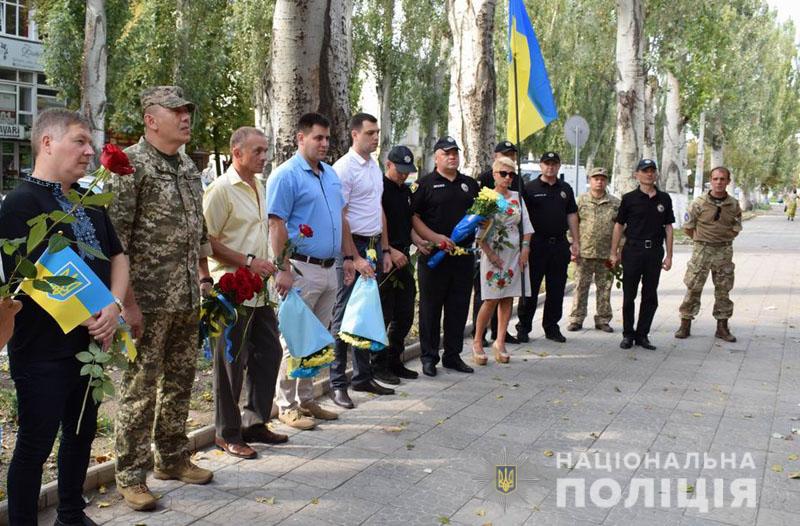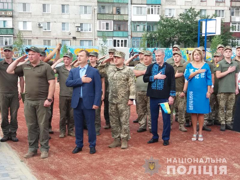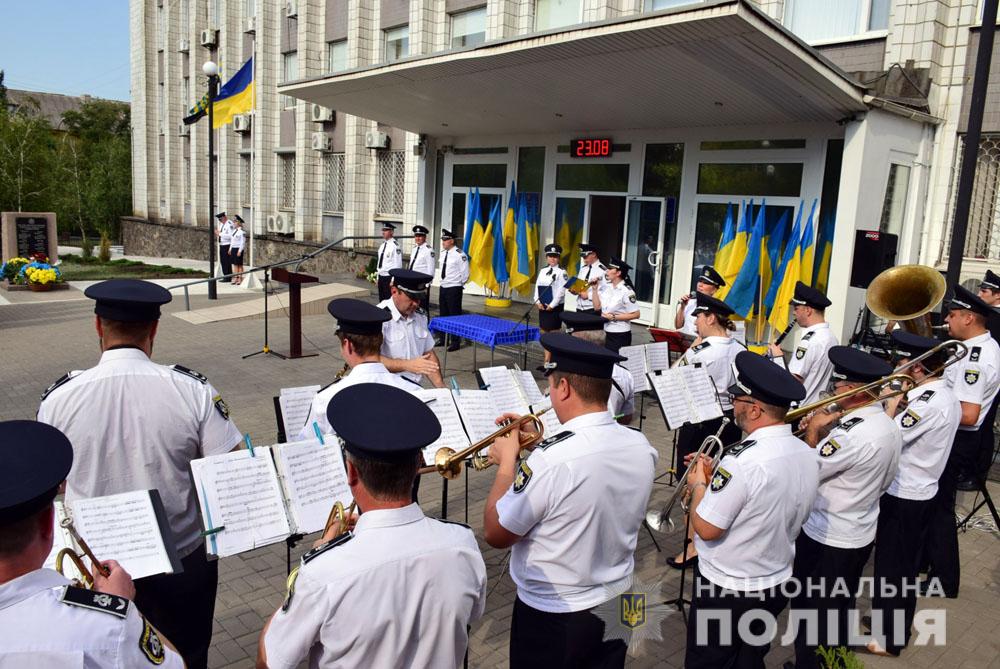 Право підняти прапор під звуки гімну України було надано найстаршому офіцеру – помічнику начальника поліції Донеччини Миколі Побойному та наймолодшій співробітниці – слідчій поліції Маріуполя Олені Бурнос.