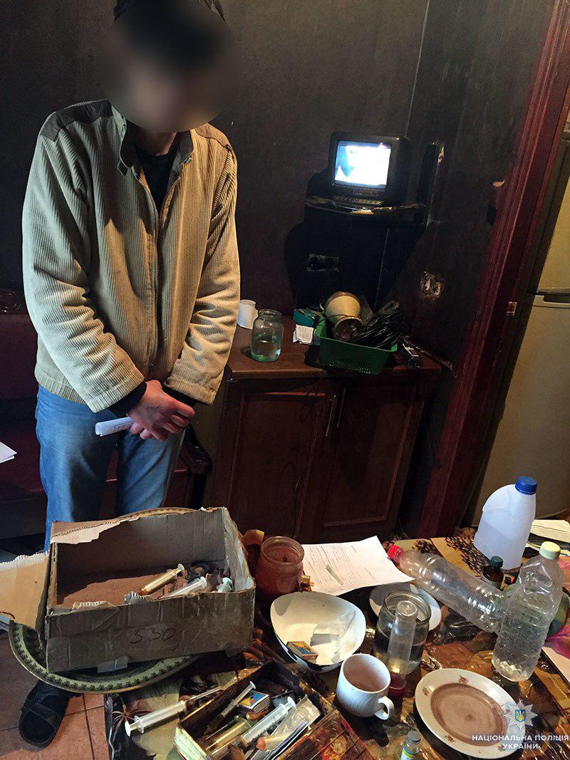 Нарковмісну рідину, прикурсори та використані шприци виявили поліцейські у квартирі 35-річного зловмисника. Раніше поліцейські вже документували аналогічний злочин за вказаною адресою. Через тимчасову відсутність вдома матері чоловік через деякий час вирішив відновити виготовлення наркотиків.