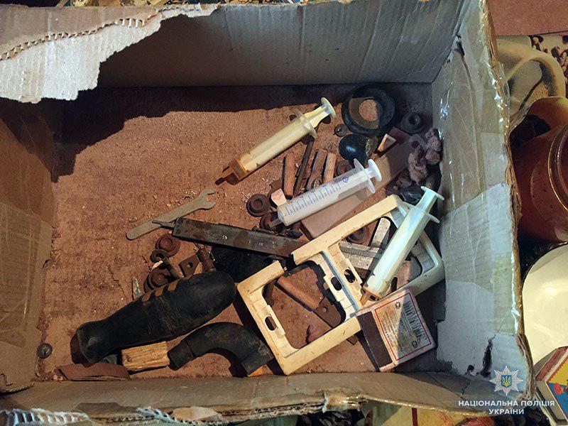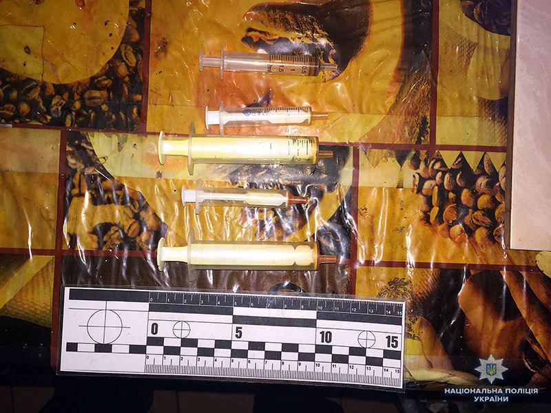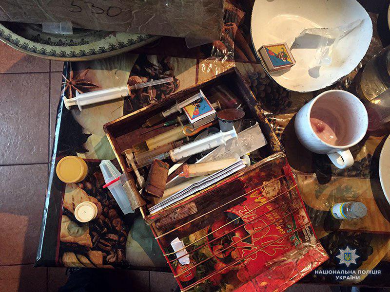 В ході проведення санкціонованого обшуку у квартирі зловмисника знаходились двоє «клієнтів». На кухні співробітники поліції виявили та вилучили ємкості з рідиною наркотичного походження, використані шприци та посуд для приготування наркотику.