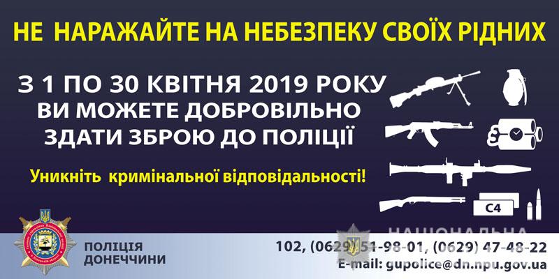 З метою виведення з незаконного обігу зброї, боєприпасів, вибухових речовин та профілактики злочинів з їхнім використанням, з 1 квітня на Донеччині стартує місячник добровільної здачі небезпечних предметів.