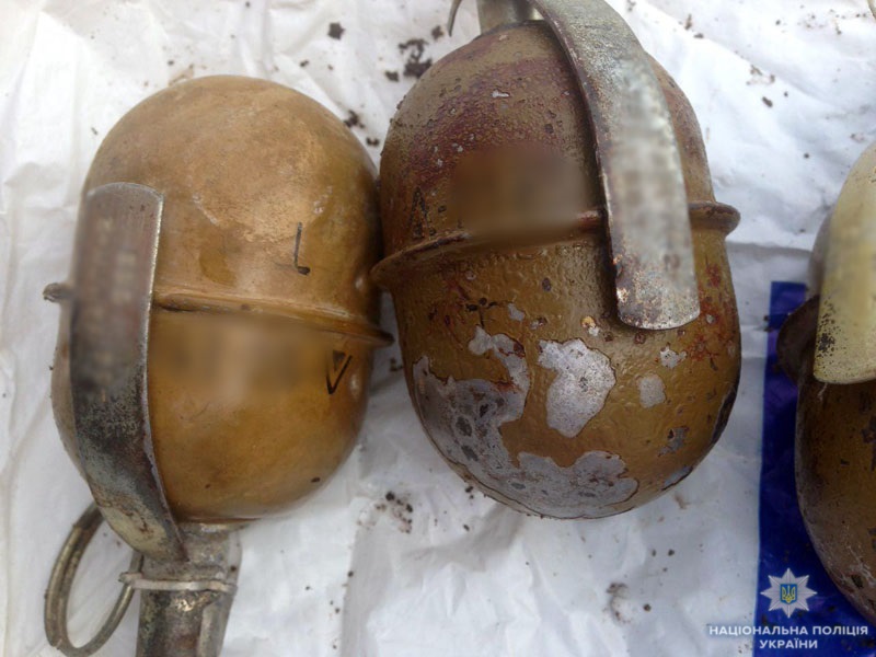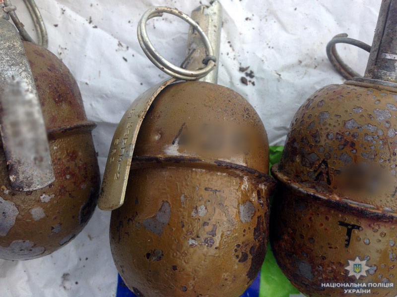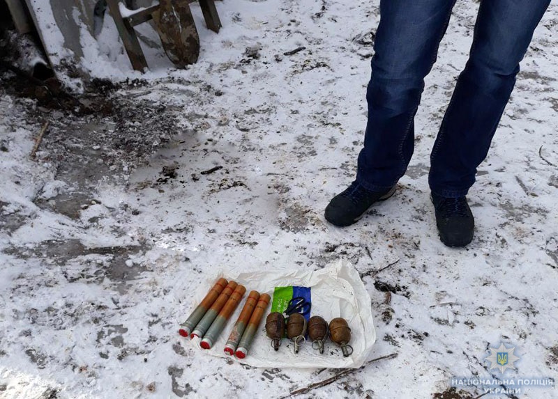 Під час обшуку оперативники виявили на подвір’ї приватного будинку колекцію гранат РГД-5 з вкрученими запалами та 5 димових шашок. Вибухонебезпечні предмети були заховані під бочкою для води.
