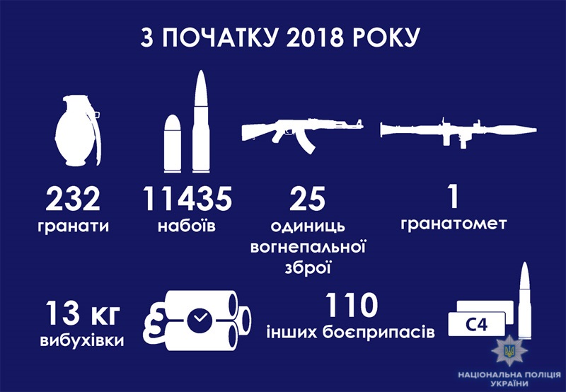 Всього з початку року поліцейські Донецької області вилучили з незаконного обігу 25 одиниць вогнепальної зброї та 11,8 тисяч боєприпасів, серед яких 232 гранати та 11,4 тисячі набоїв, а також 13 кг вибухових речовин.