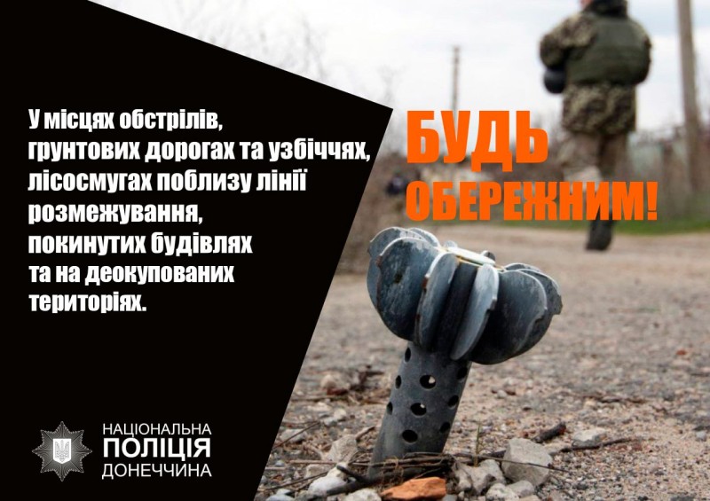 Нагадуємо мешканцям Донеччини про небезпеку, яка загрожує на необстежених ділянках. Якою безпечною не була б дорога, не з’їжджайте на узбіччя і не сходьте з неї. Якщо сапери й розмінували проїжджу частину, це не означає, що лісосмугу або поле, що поруч, уже також перевірили.