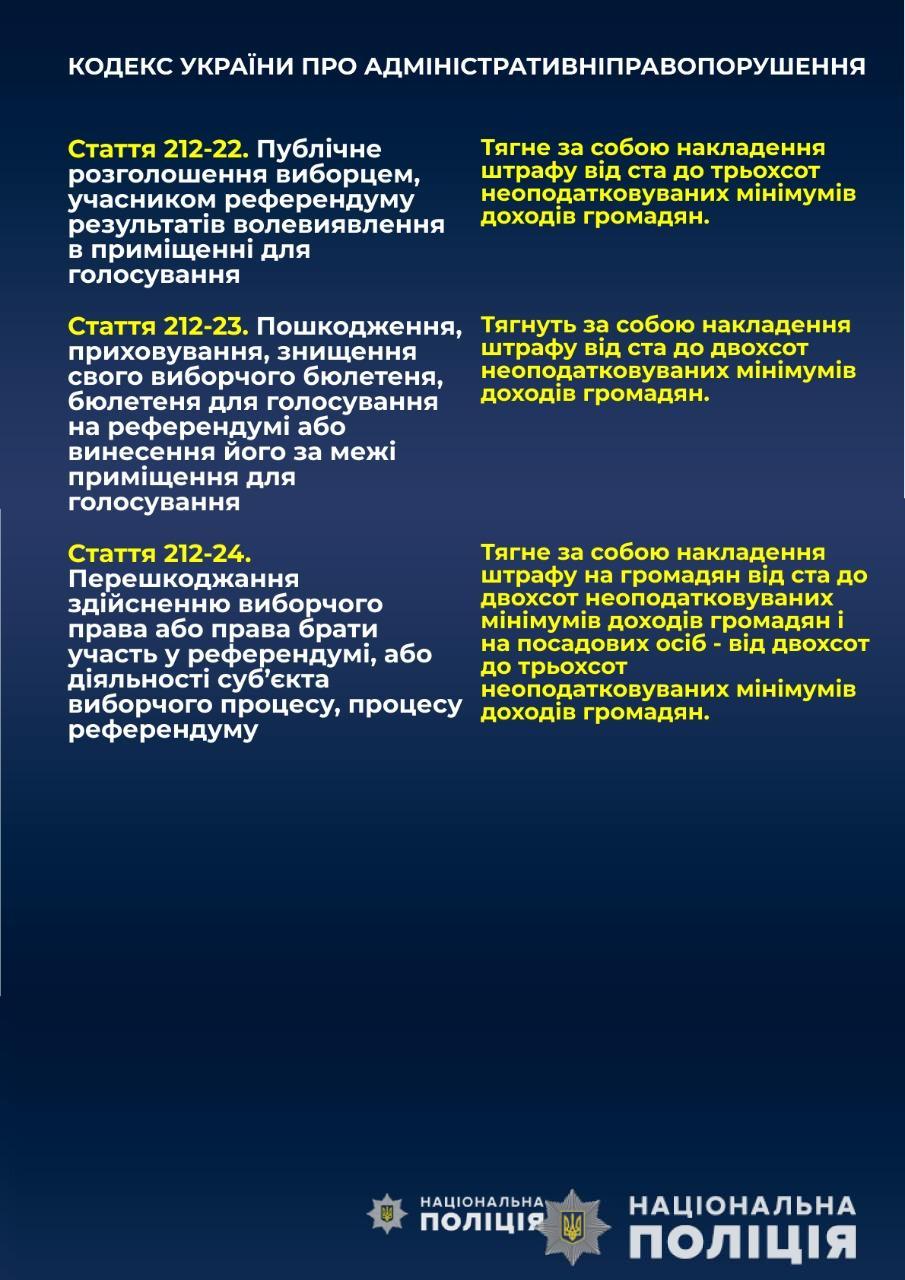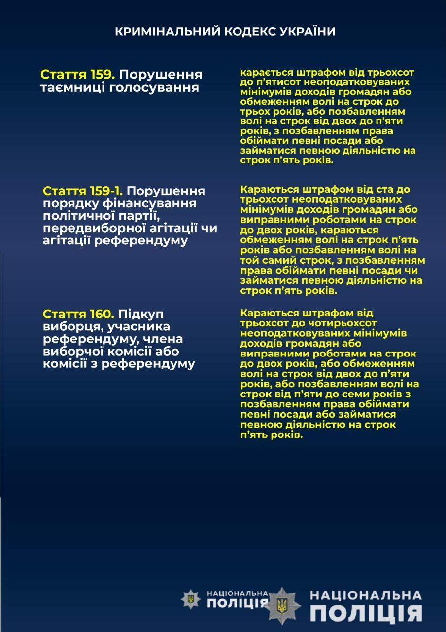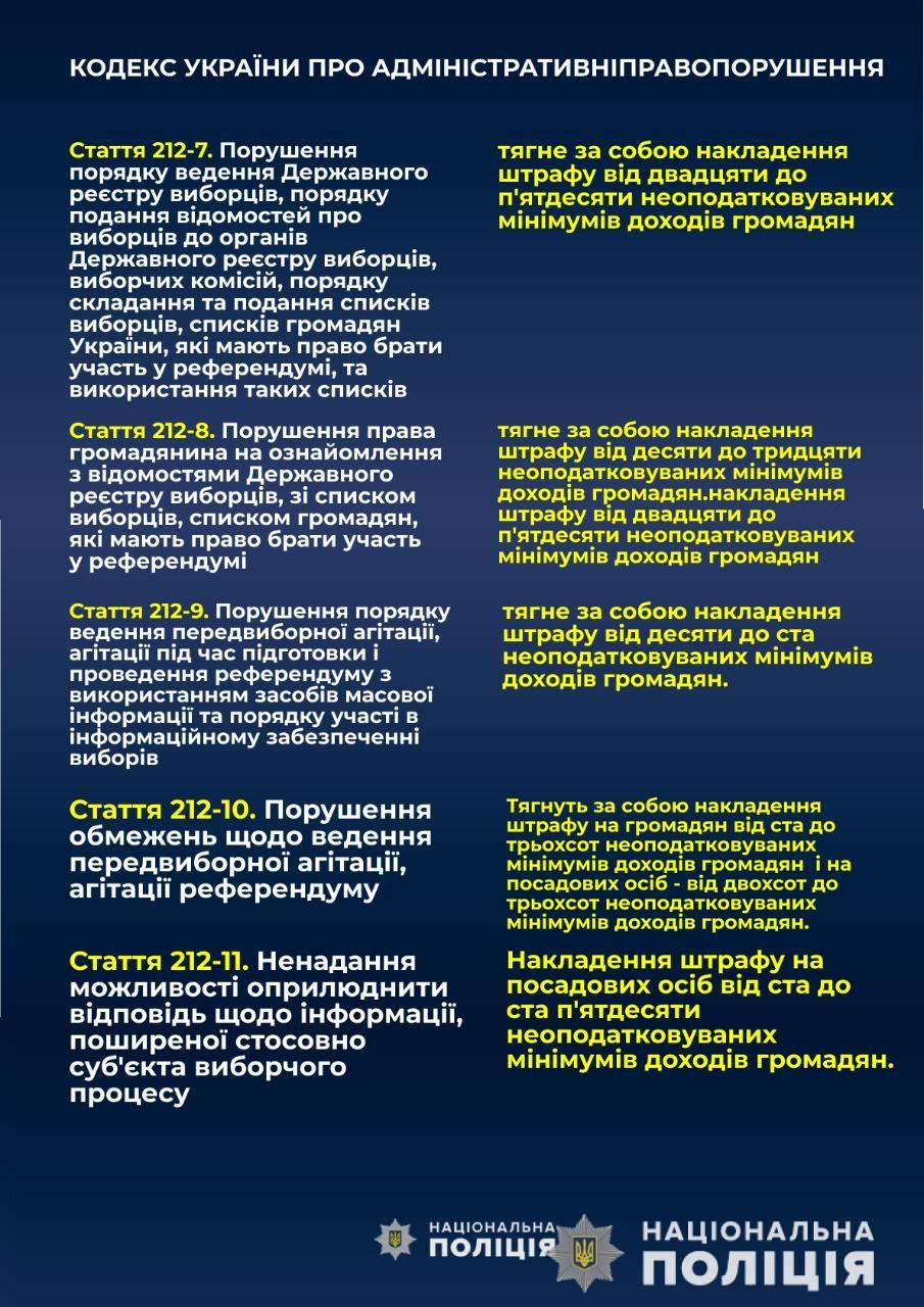 Відповідно до частини 7 статті 23 «Публічність і відкритість виборчого процесу» Виборчого кодексу України, органи Національної поліції України за день до дня голосування оприлюднюють на офіційних веб-сайтах попередні відомості про кількість зареєстрованих звернень про порушення виборчого законодавства під час відповідного виборчого процесу та роз’яснення відповідальності за порушення законодавства про вибори.