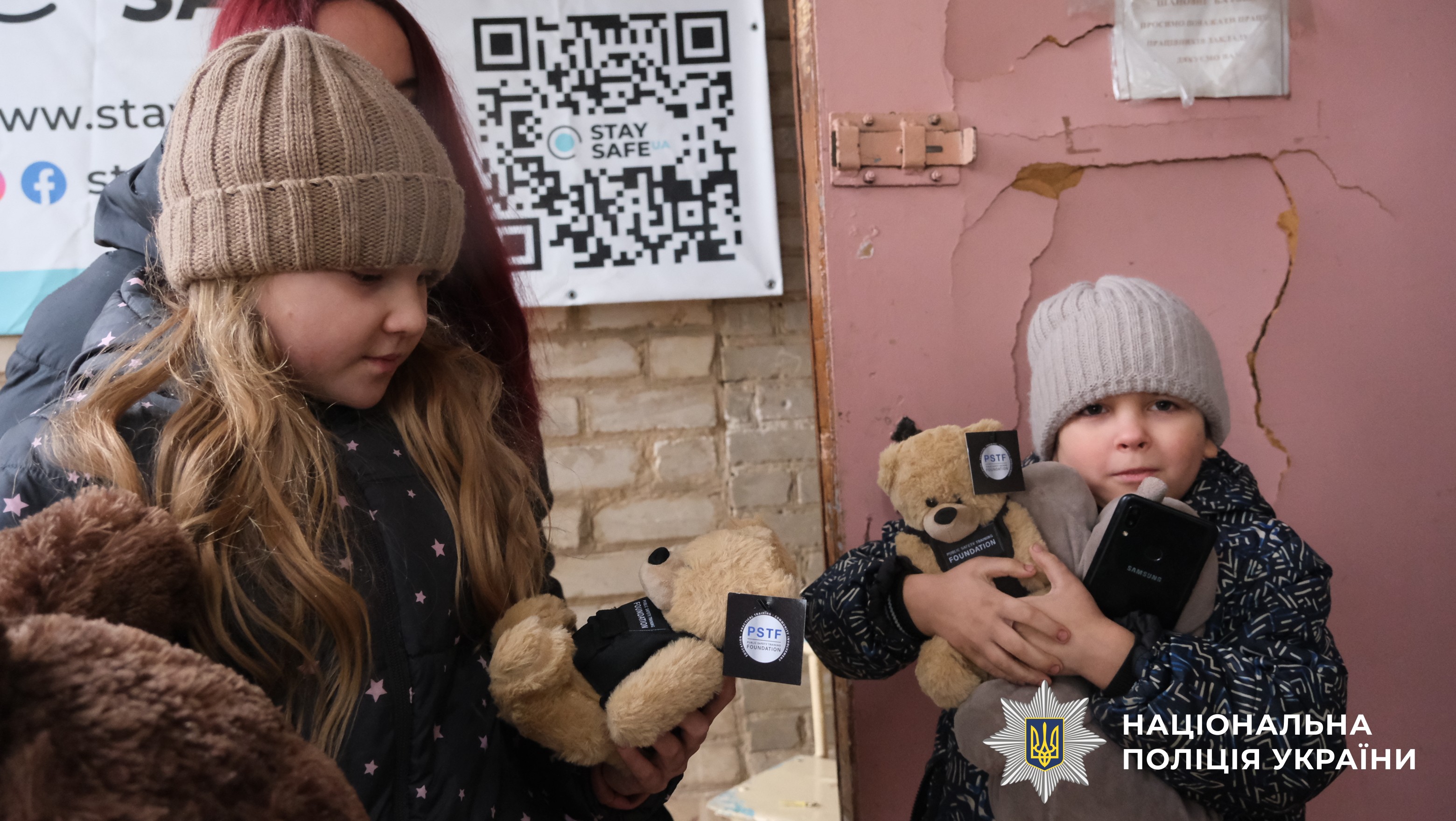 Діти отримали від поліцейських подарунок - м’яких ведмедиків. Ці іграшки передали екіпажам поліції волонтери для психологічної підтримки малечі під час евакуацій.