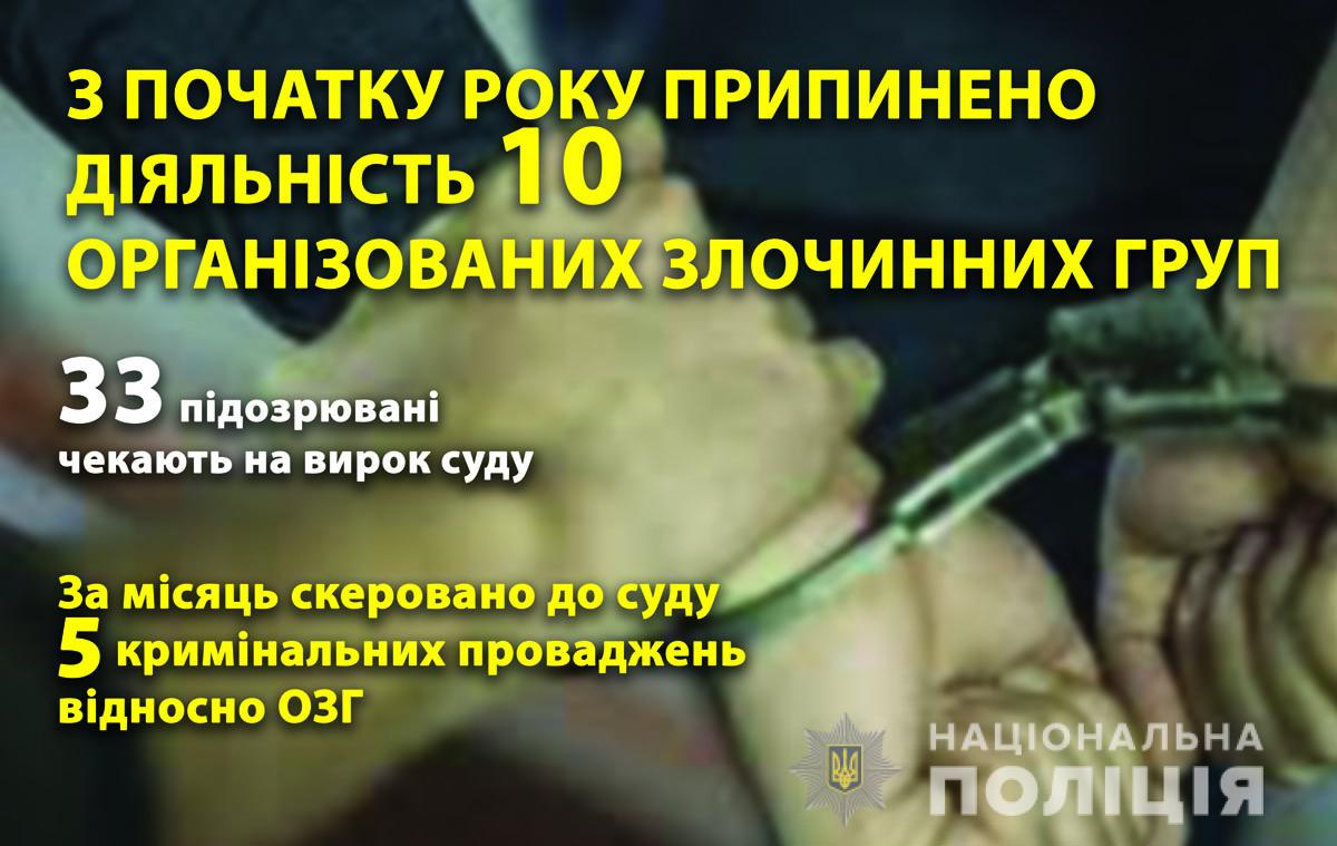 Збут наркотичних речовин, заволодіння та реалізація асфальтобетонної суміші, незаконний видобуток корисної копалини - заради наживи злочинці не зупинилися, ані перед законом, ані перед моральними нормами суспільства. Загалом від початку року припинено діяльність десяти угруповань. Розслідування по ним завершено. Тепер 33 підозрювані чекають на вирок суду.