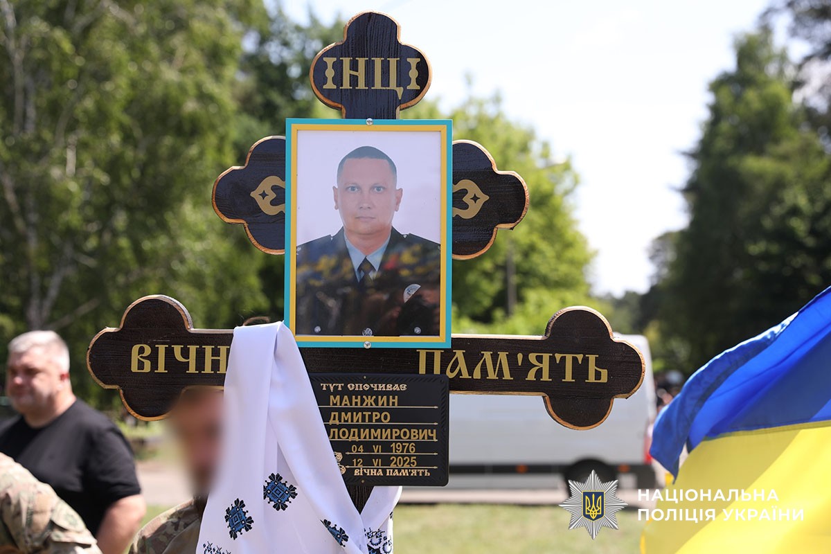 Життя бійця батальйону поліції особливого призначення (стрілецького) ГУНП в Донецькій області майора поліції Дмитра Манжина обірвав російський дрон поблизу Костянтинівки. Йому назавжди 49. Героя поховали на Лісовому кладовищі в Києві, де нині мешкає його родина. Вшанувати пам’ять Дмитра зібралися рідні, друзі, бойові побратими, представники влади, керівництво Національної поліції України та поліції Донеччини.